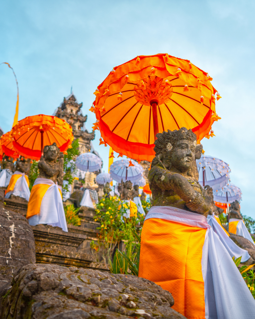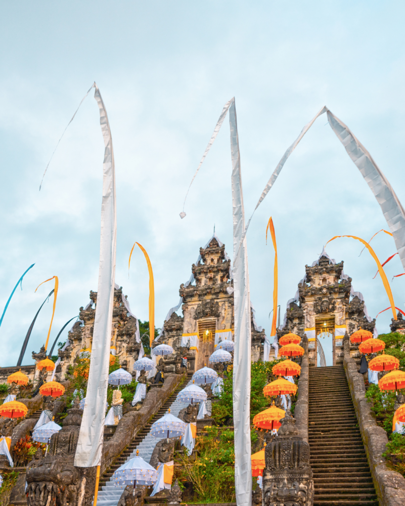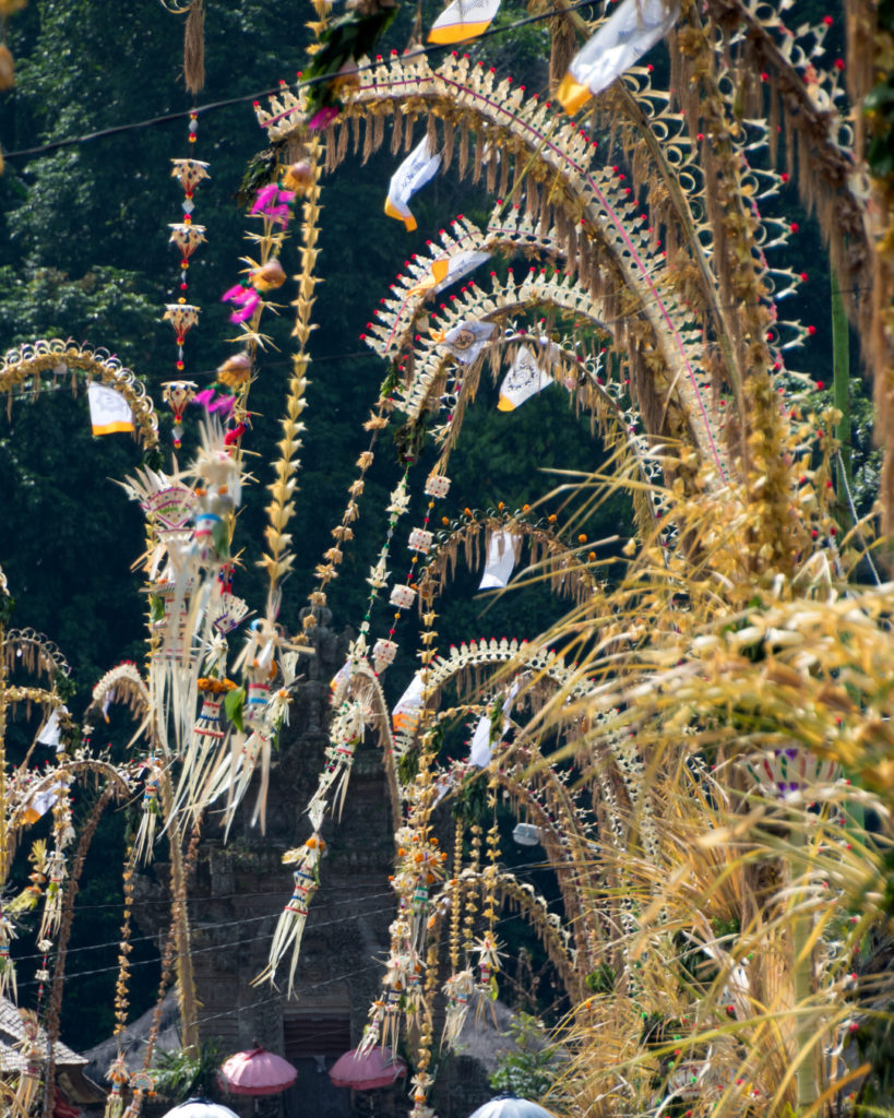 Durant ces festivités, Bali se transforme. Les maisons et les routes sont décorées de penjor, et les Balinais se rassemblent en famille dans les temples, tous vêtus de tissus blancs et jaunes pour prier et offrir des offrandes.