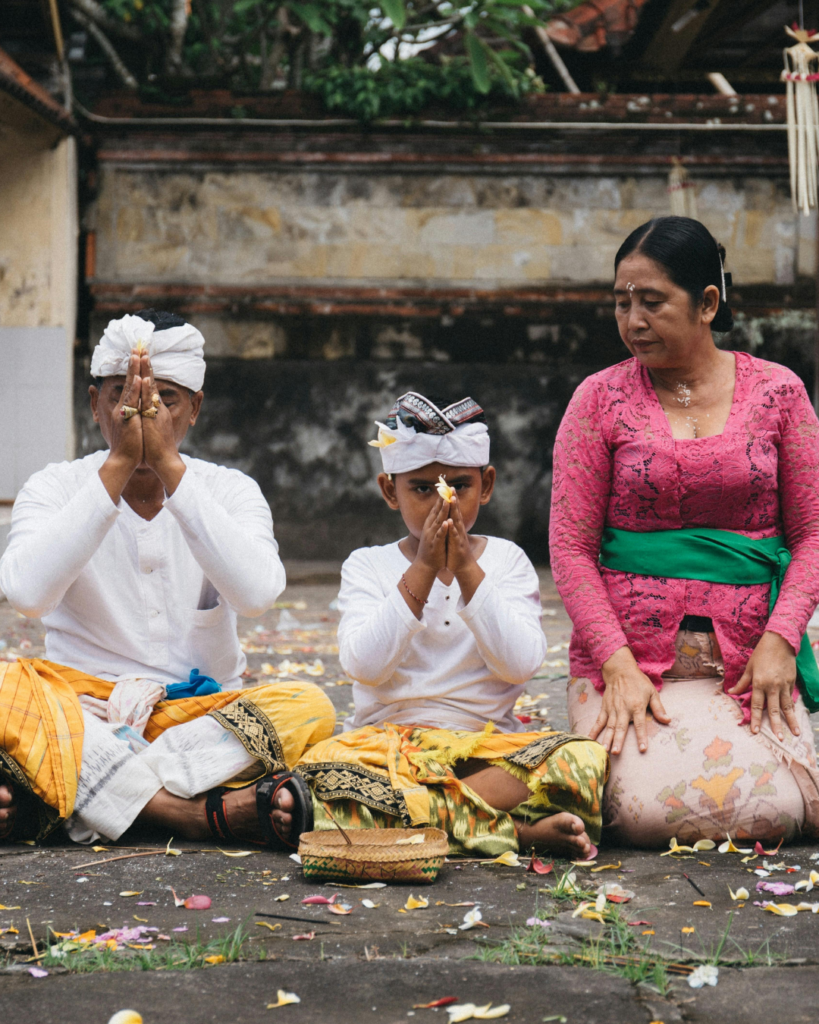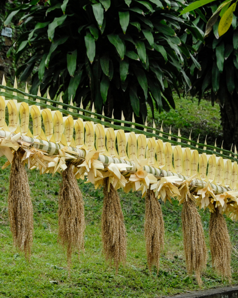 Dans les maisons et les temples, les familles balinaises créent des offrandes en fleurs, riz et encens, soigneusement disposées dans de petites coupelles en feuilles tressées. Ces offrandes, déposées chaque matin, sont un acte de gratitude et de respect envers les esprits des ancêtres et les divinités.