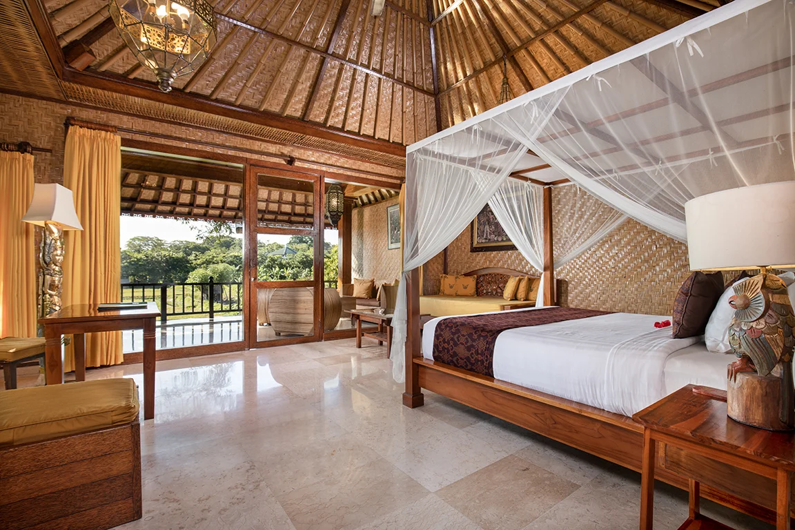 Panorama ricefield-view, big terrace or balcony, spacious rooms, nicely furnished, double-bed, marble bathroom with bathtub and separate hot shower, AC, telephone, minibar, hair dryer, safety box, electric kettle.