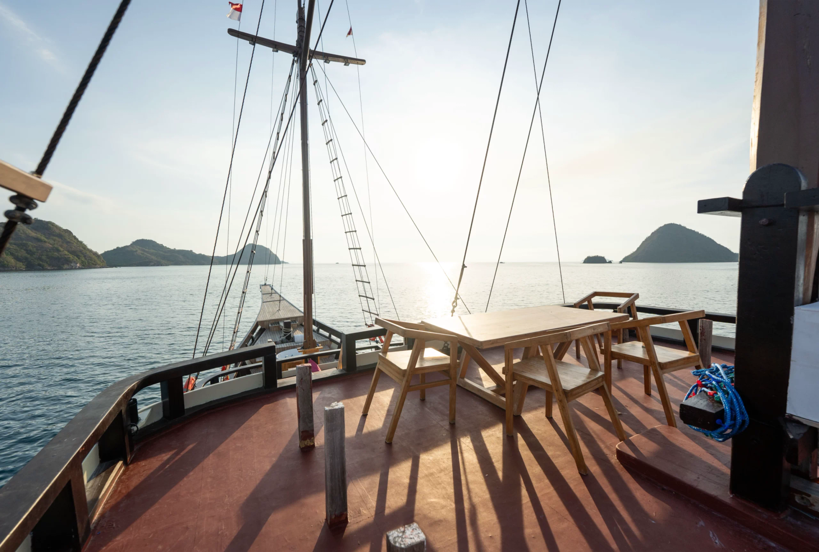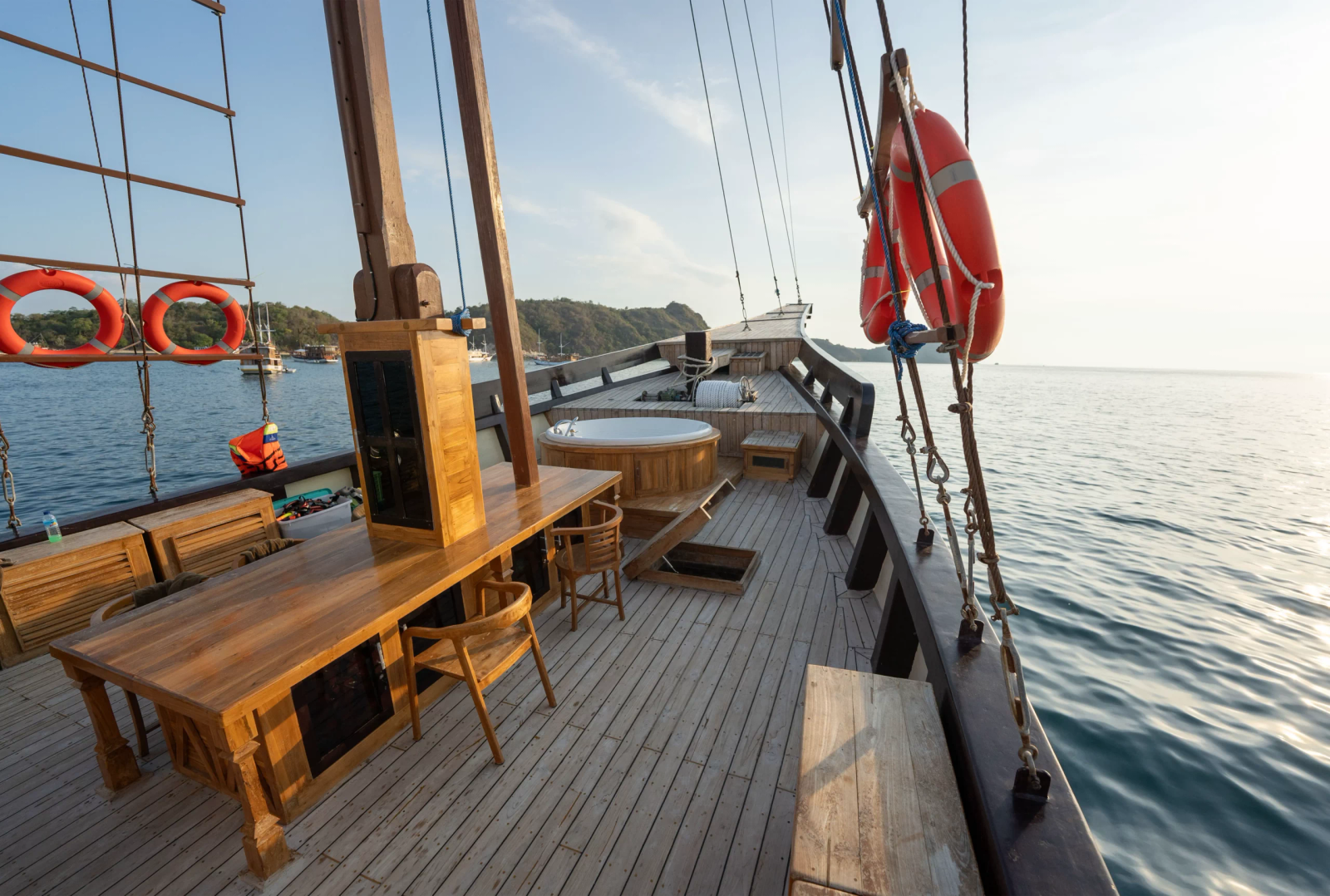 Embark on a remarkable journey across the pristine waters between Lombok and Labuan Bajo aboard Al Fatran 3, a traditional wooden Phinisi boat designed to provide an unforgettable sailing experience. With a friendly crew of 9, the boat has a large sundeck and plenty of space to relax, making it easy to enjoy the sun and sea. Guests can unwind on the comfortable lazy bean bags or enjoy the onboard jacuzzi, making the most of their time during the Komodo sailing adventure.