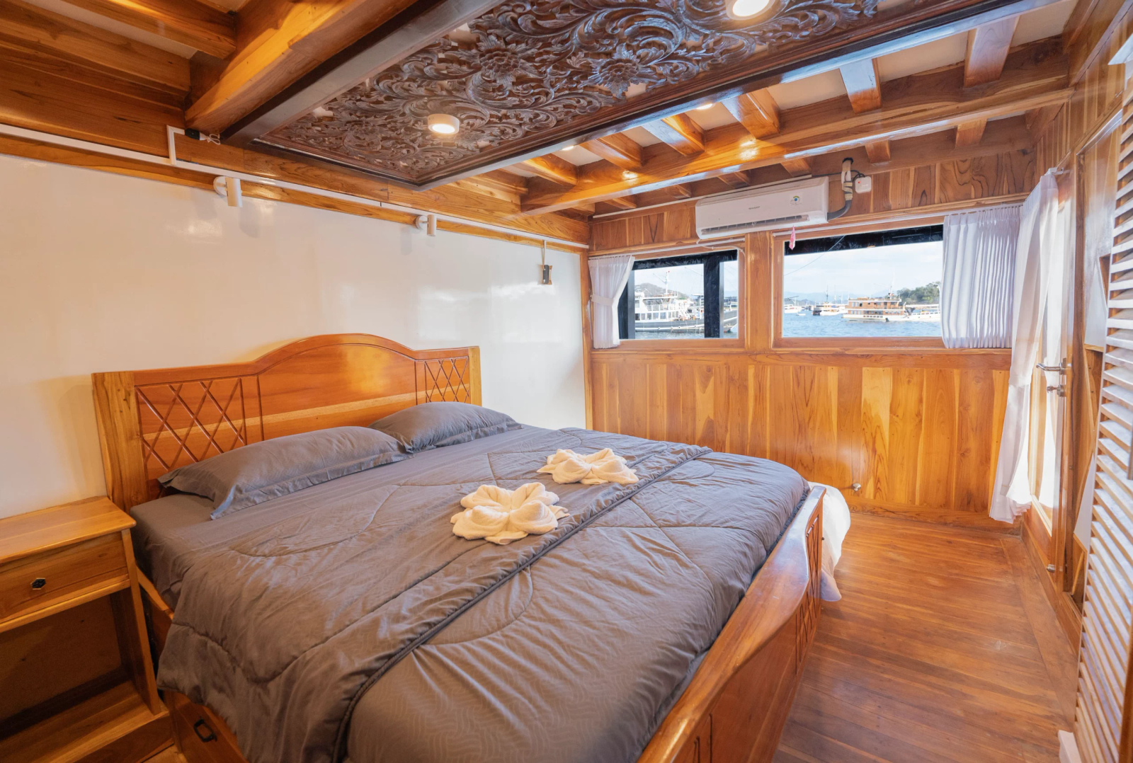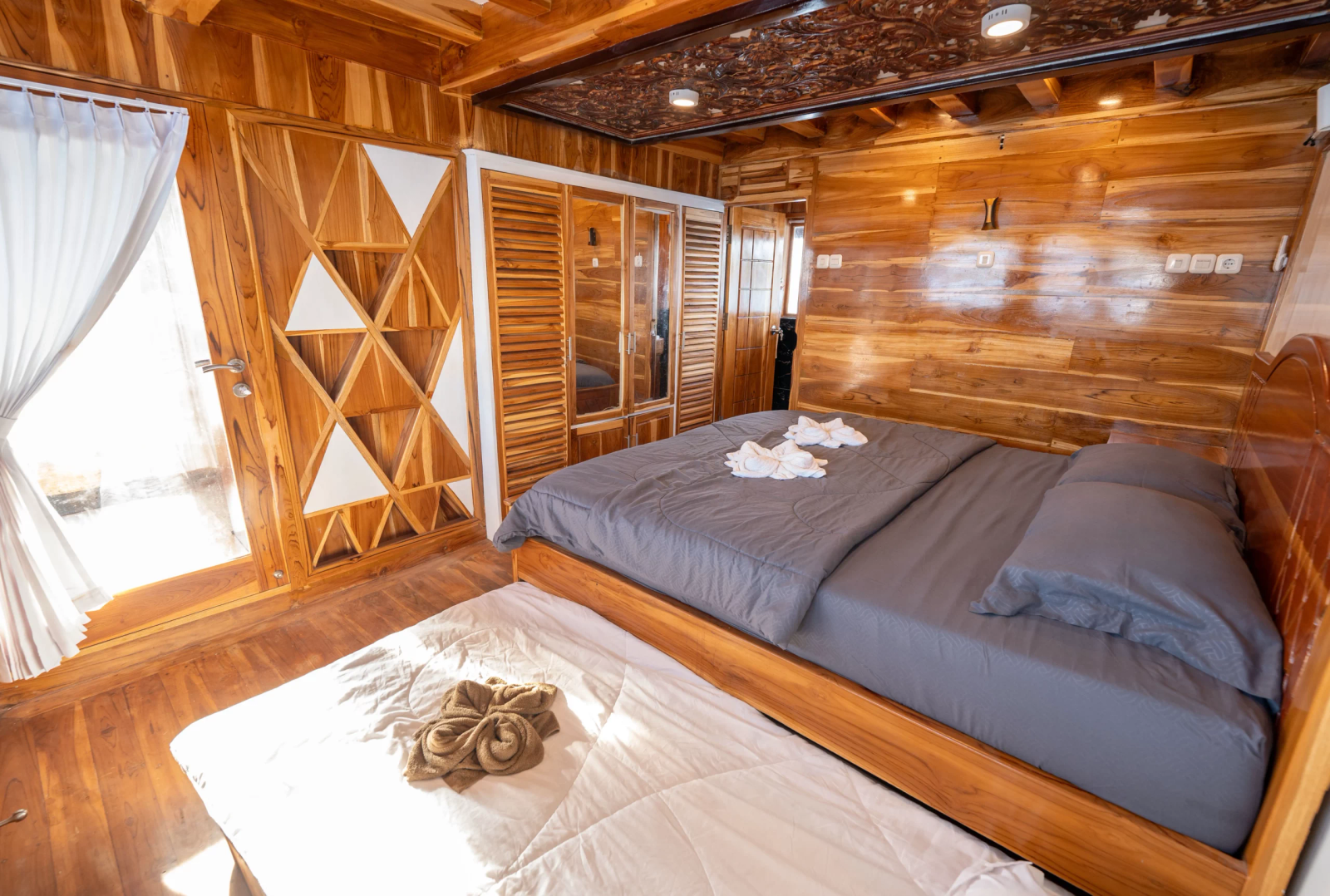 Located on the lower deck, the cozy Gili Room accommodates 2 guests with a comfortable queen bed. Each of the 4 cabins includes a private bathroom, ensuring a relaxing and convenient stay. Perfect for couples, these rooms provide a tranquil retreat after a day of exploring the stunning islands.