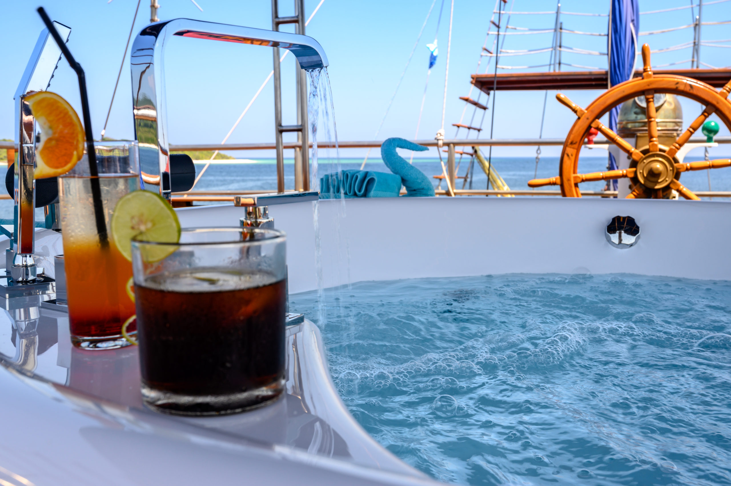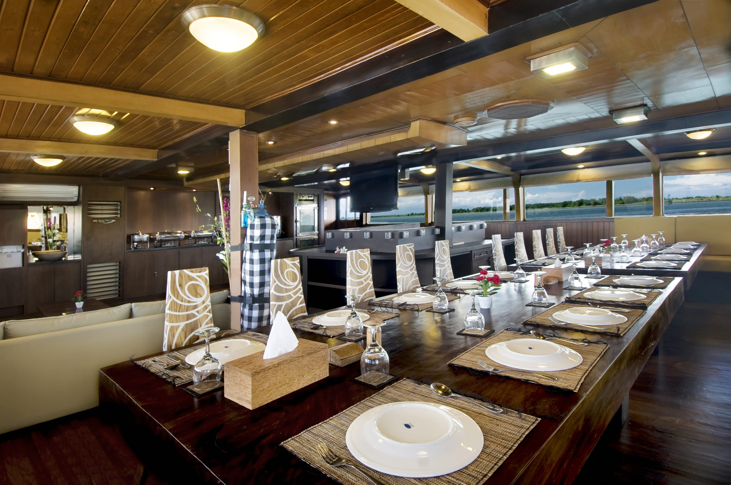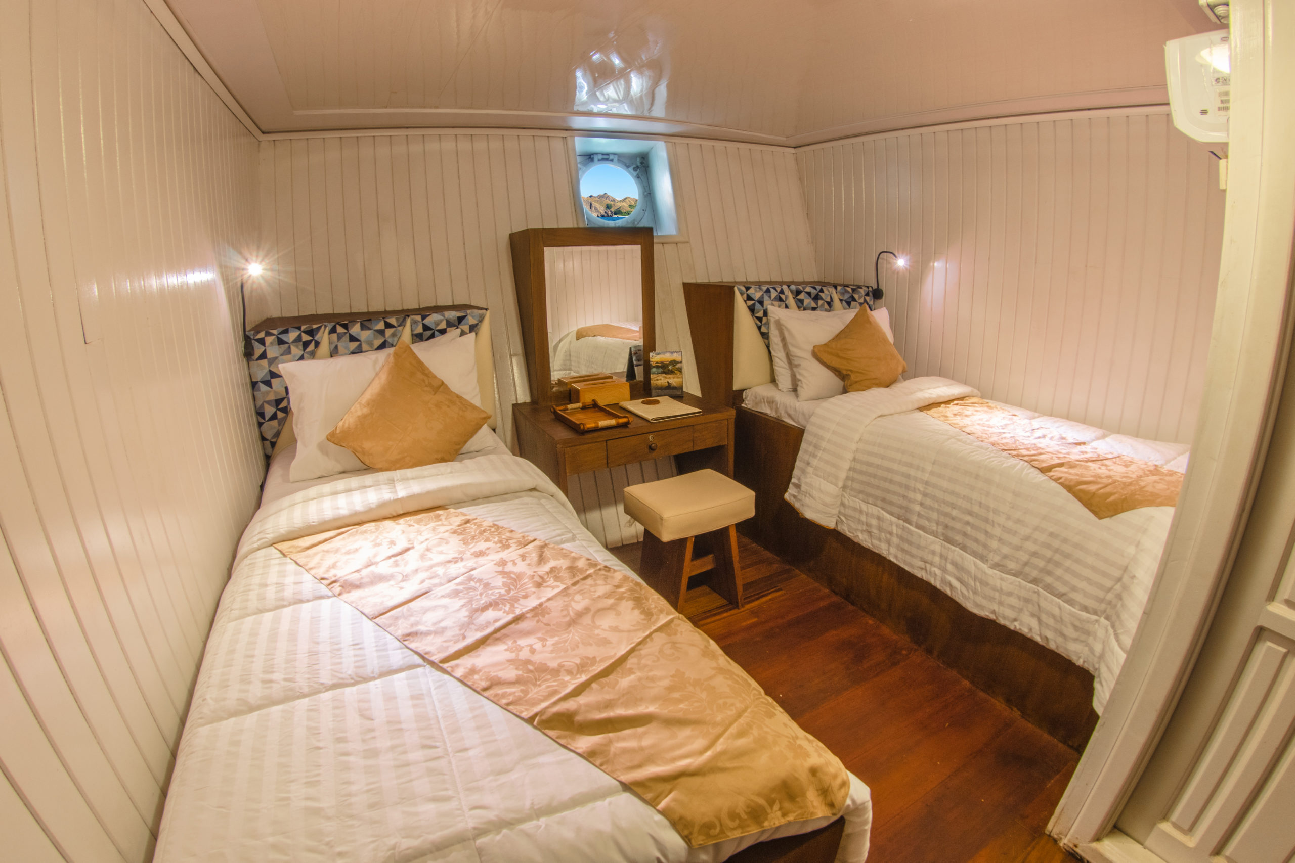 - 14 guest cabins = 24 people with private bathroom, basin, hot & cold shower and air conditioner in each room as follows : 6 cabins with double bed in the lower and upper deck, 6 cabins with twin bed in the lower and middle deck, and 2 cabins with single bed in the middle deck