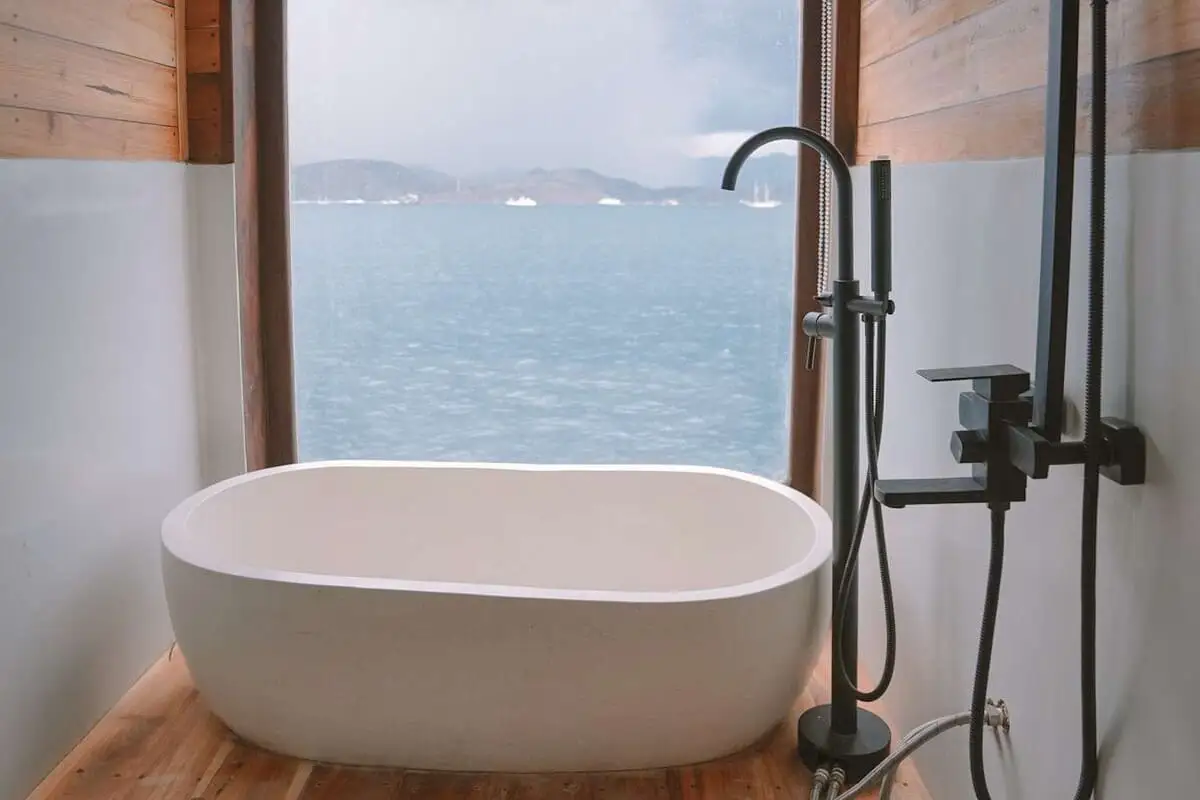 Upper deck, ocean view, ensuite bathroom and bathtub.