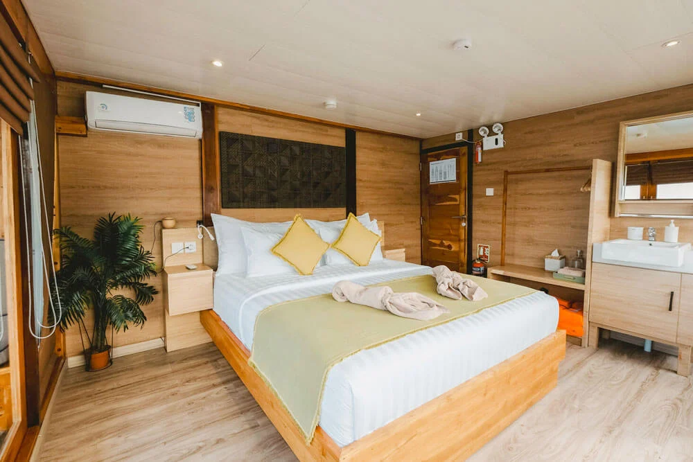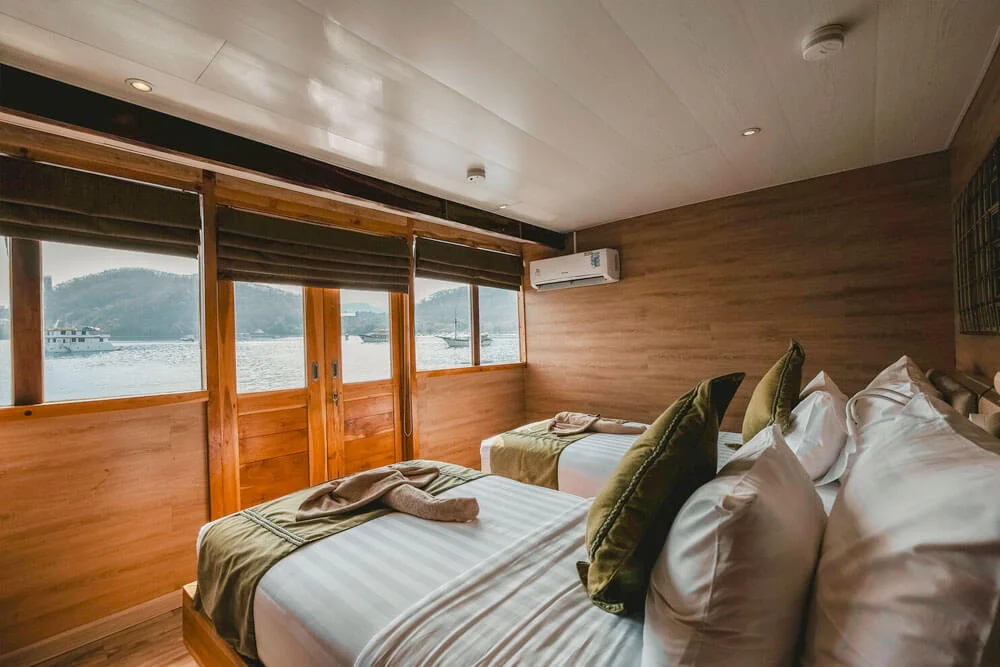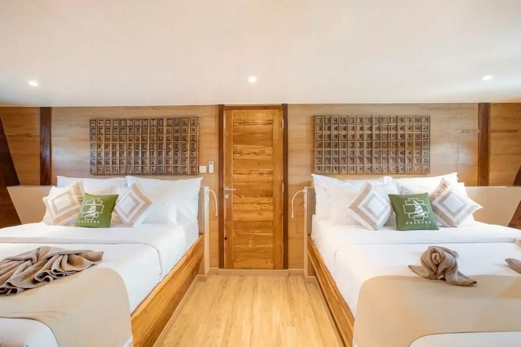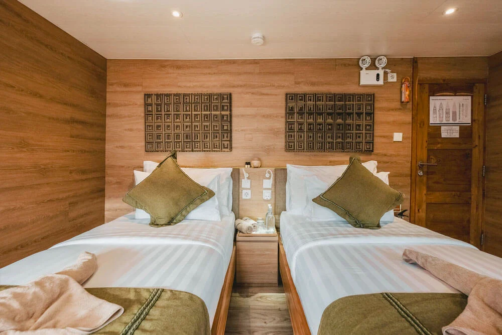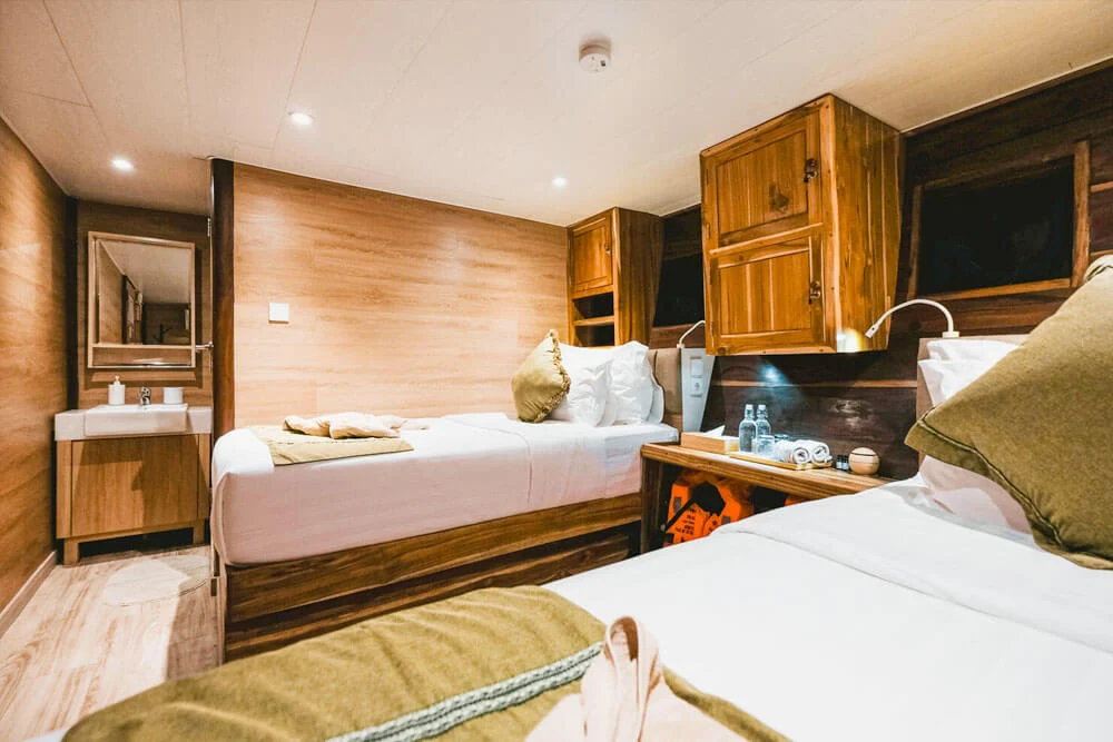 A spacious family-sized suite with two double beds. Located on the lower deck, this 24m2 cabin offers individually controlled air-conditioning units, plenty of storage room, and private en-suite bathrooms with hot water.