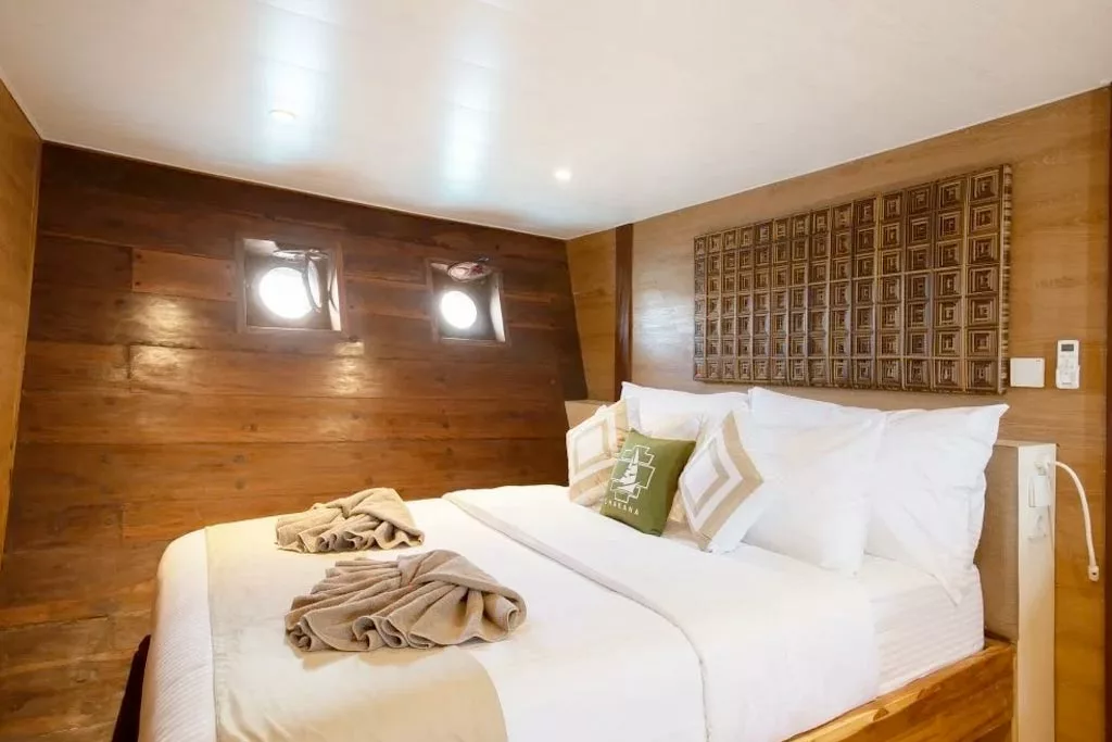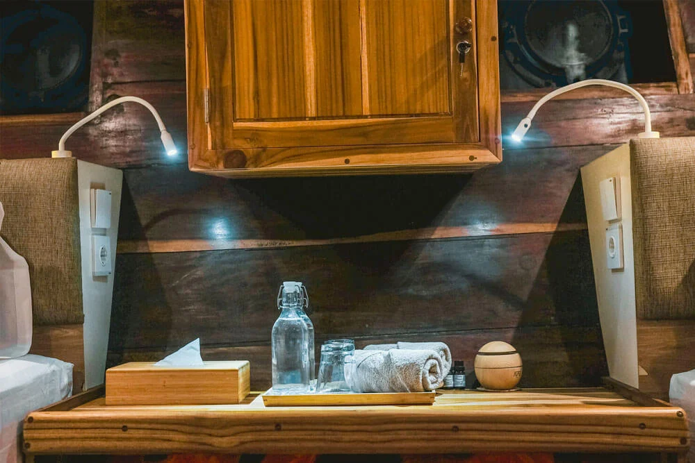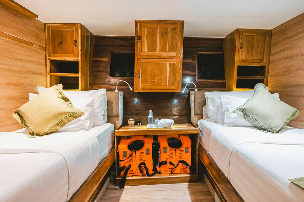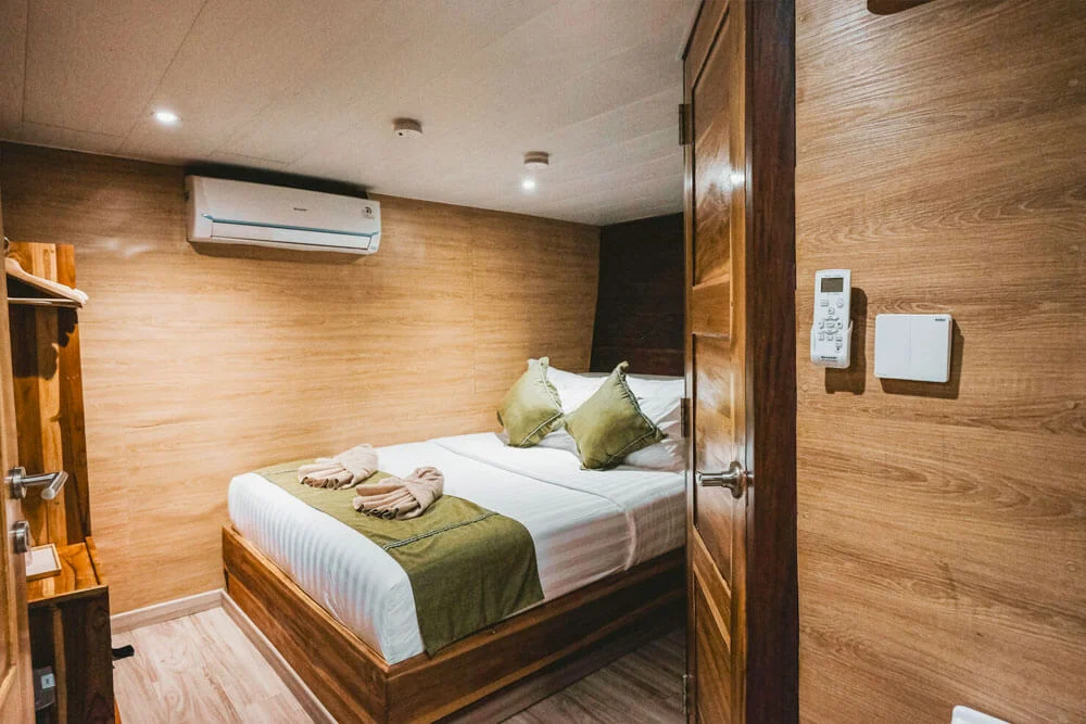 Cabins 5 & 6 are double cabins situated on the lower deck. They come with individually controlled air conditioning, ample storage space, and private bathrooms with hot water.