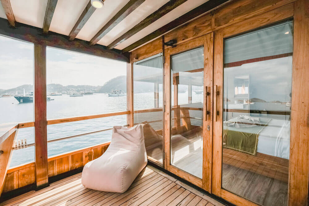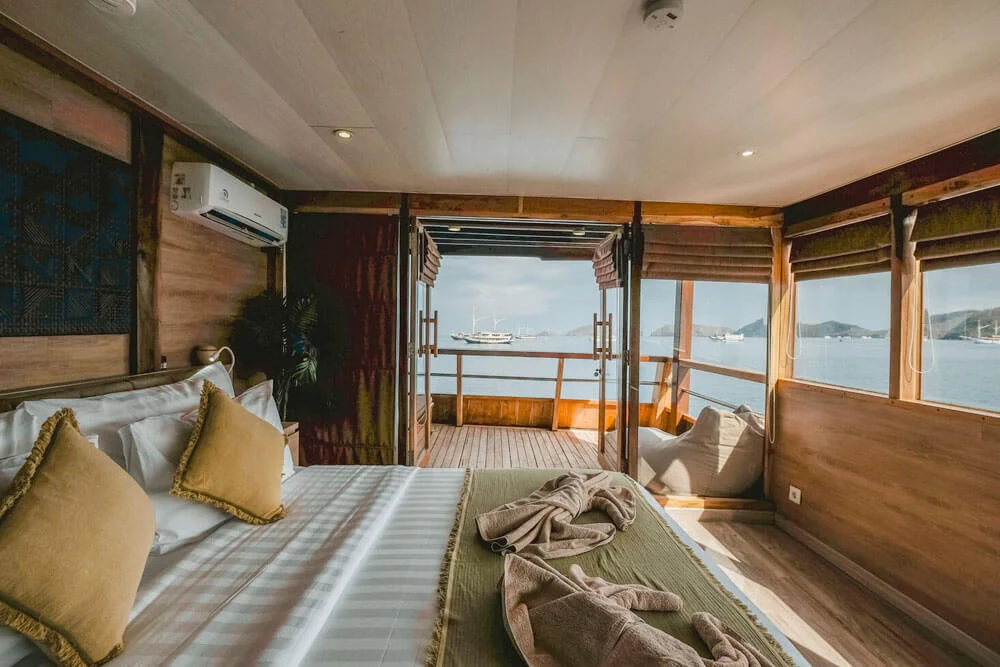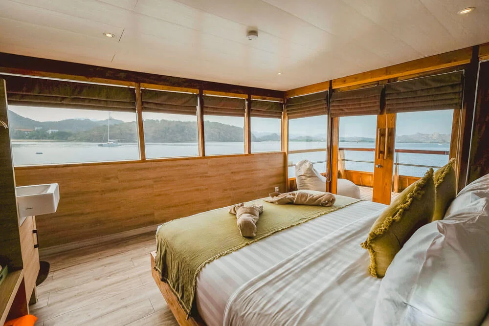 Cabins 1 & 2 are spacious double suites located on the upper deck. These cabins, covering 22 square meters, feature private balconies, air conditioning, lots of storage space, and private bathrooms with hot water.