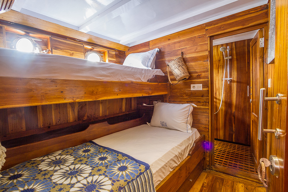Specially designed for an exclusive liveaboard experience, Kelana can host up to 6 passengers. The boat boasts three spacious cabins, including a master cabin, a double cabin, and a bunk cabin. The beautiful wooden interior adds a touch of elegance and warmth to the living spaces. Air conditioning and modern ensuite bathrooms come as standard.