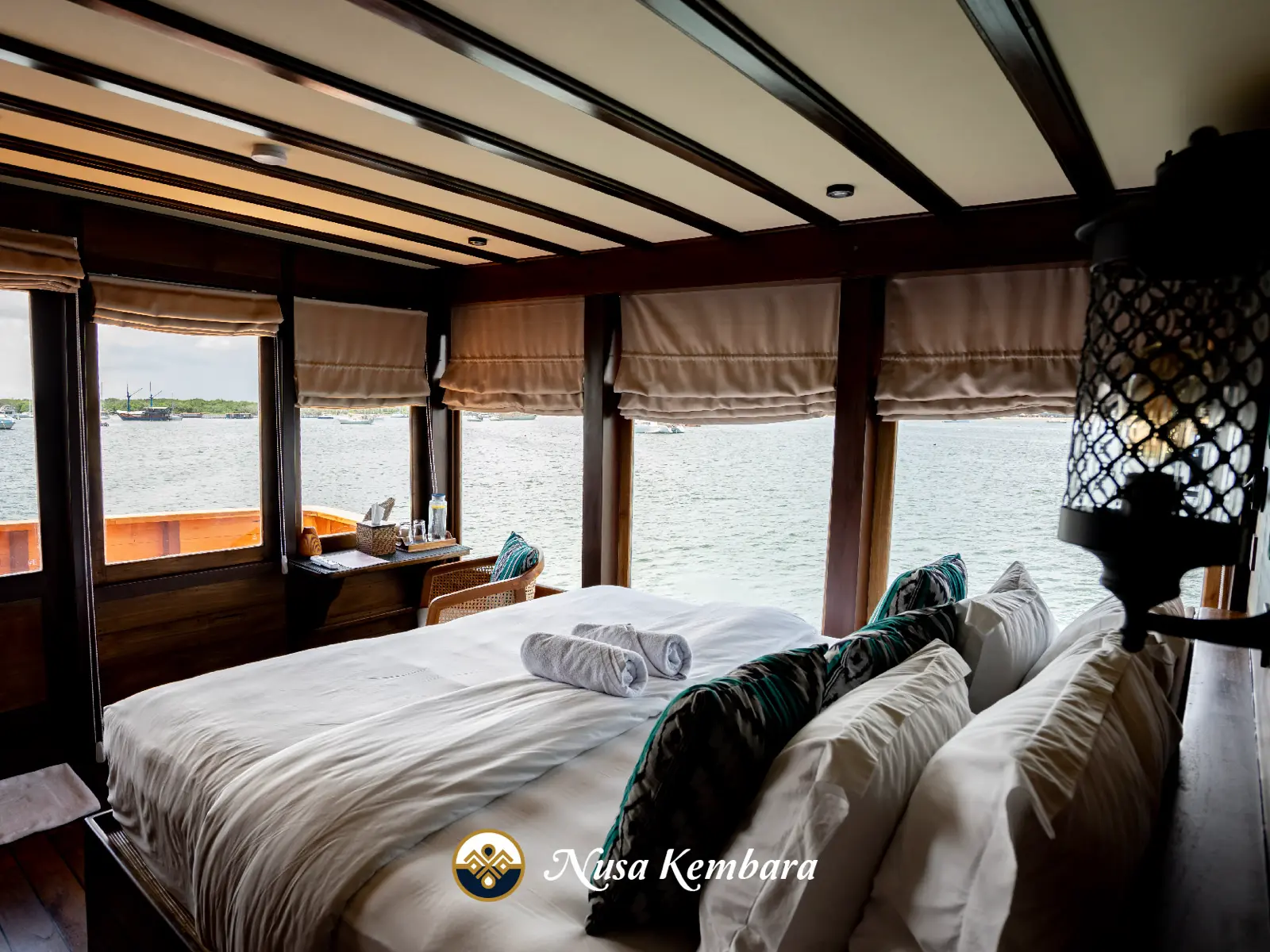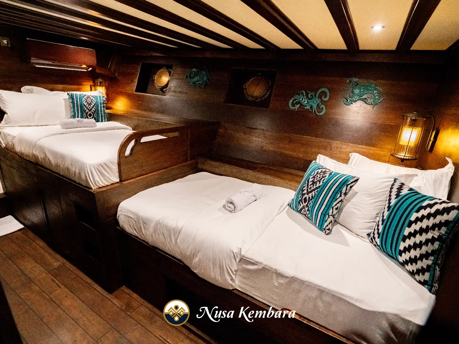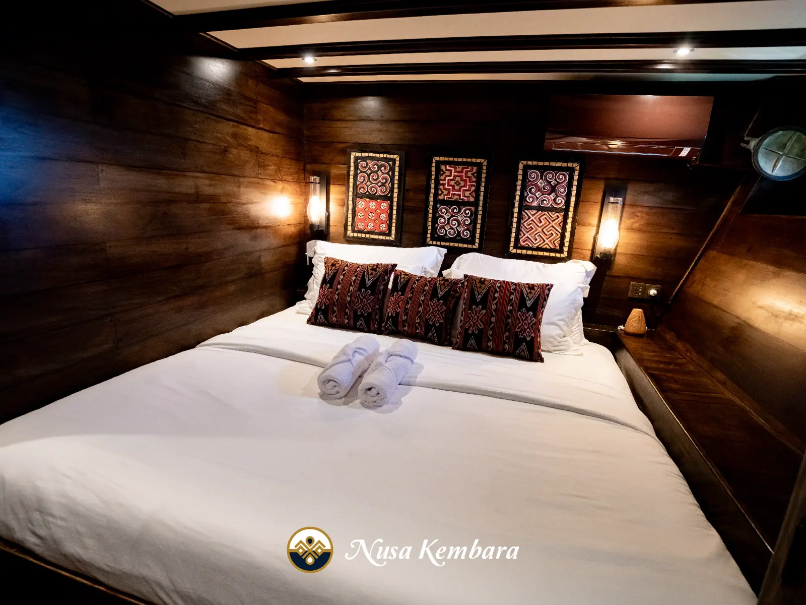 Nusa Kembara features 8 ensuite bedrooms (6 doubles and 2 twins), comfortably accommodating up to 16 adults and kids. Each room is equipped with air conditioning, a private bathroom with hot and cold shower, and full amenities. Rooms on the main and upper decks offer stunning sea views, while the lower deck rooms have small windows, allowing you to enjoy a cozy and private retreat.