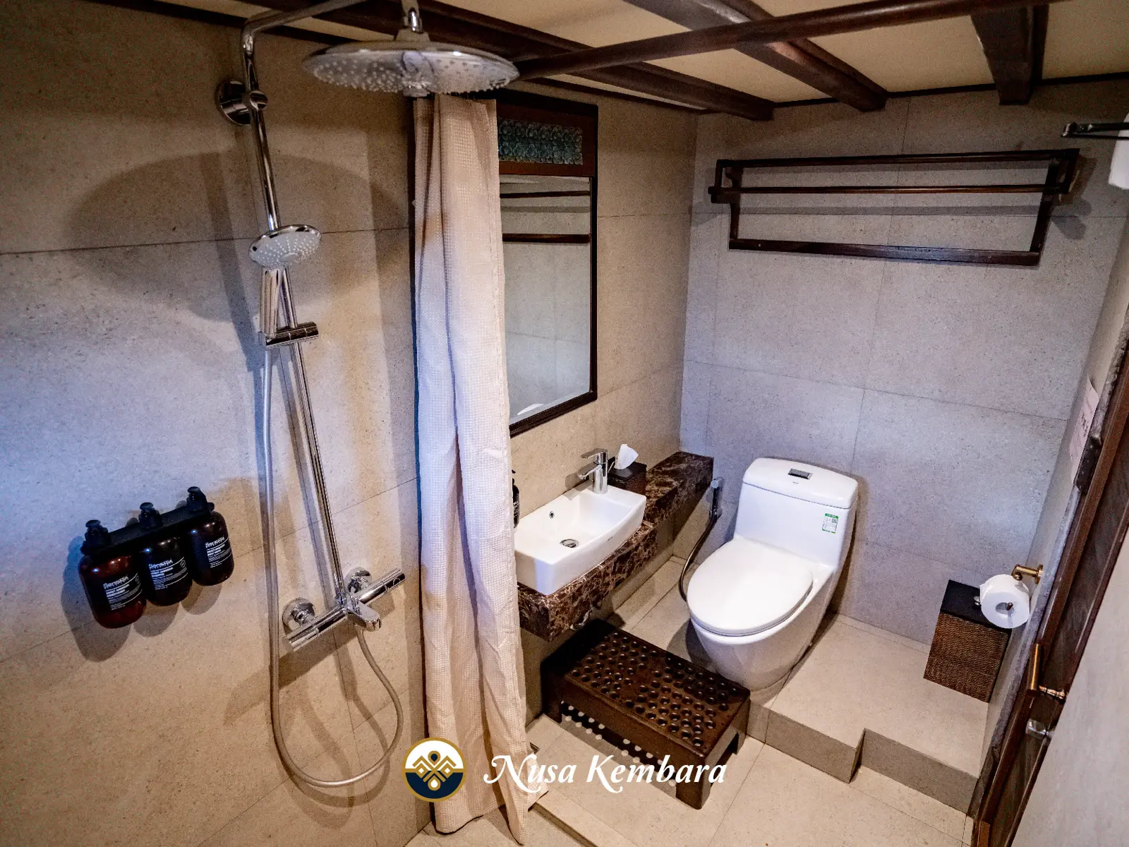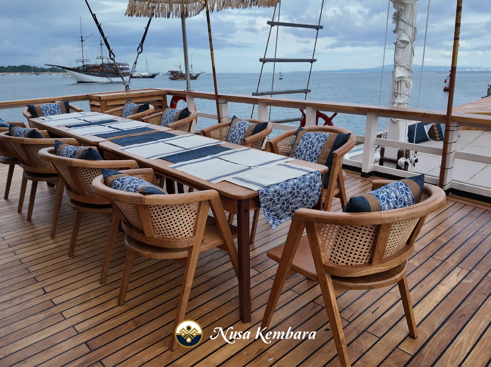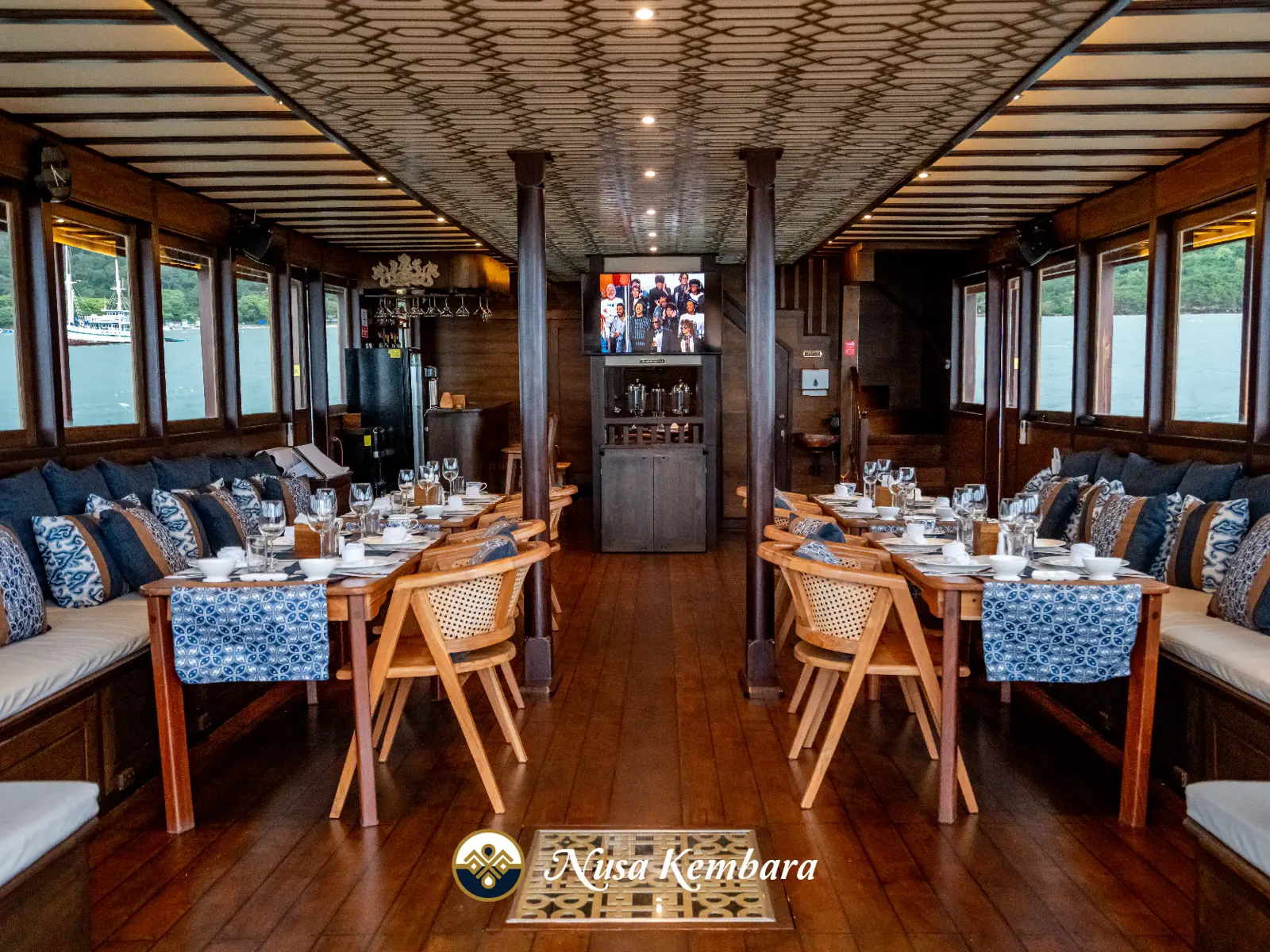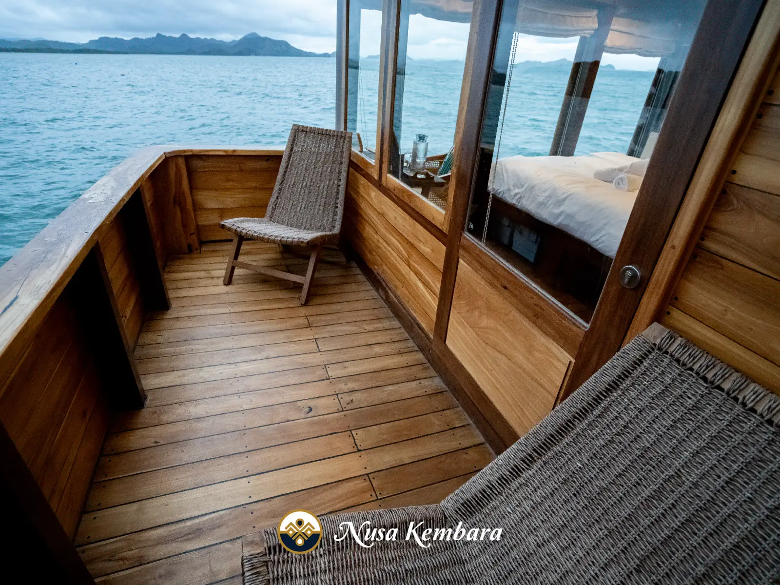 Nusa Kembara features 8 ensuite bedrooms (6 doubles and 2 twins), comfortably accommodating up to 16 adults and kids. Each room is equipped with air conditioning, a private bathroom with hot and cold shower, and full amenities. Rooms on the main and upper decks offer stunning sea views, while the lower deck rooms have small windows, allowing you to enjoy a cozy and private retreat.