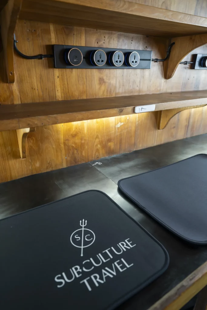 • Camera Room: Purpose-built for underwater photographers with individual workstations, lighting, and charging stations.