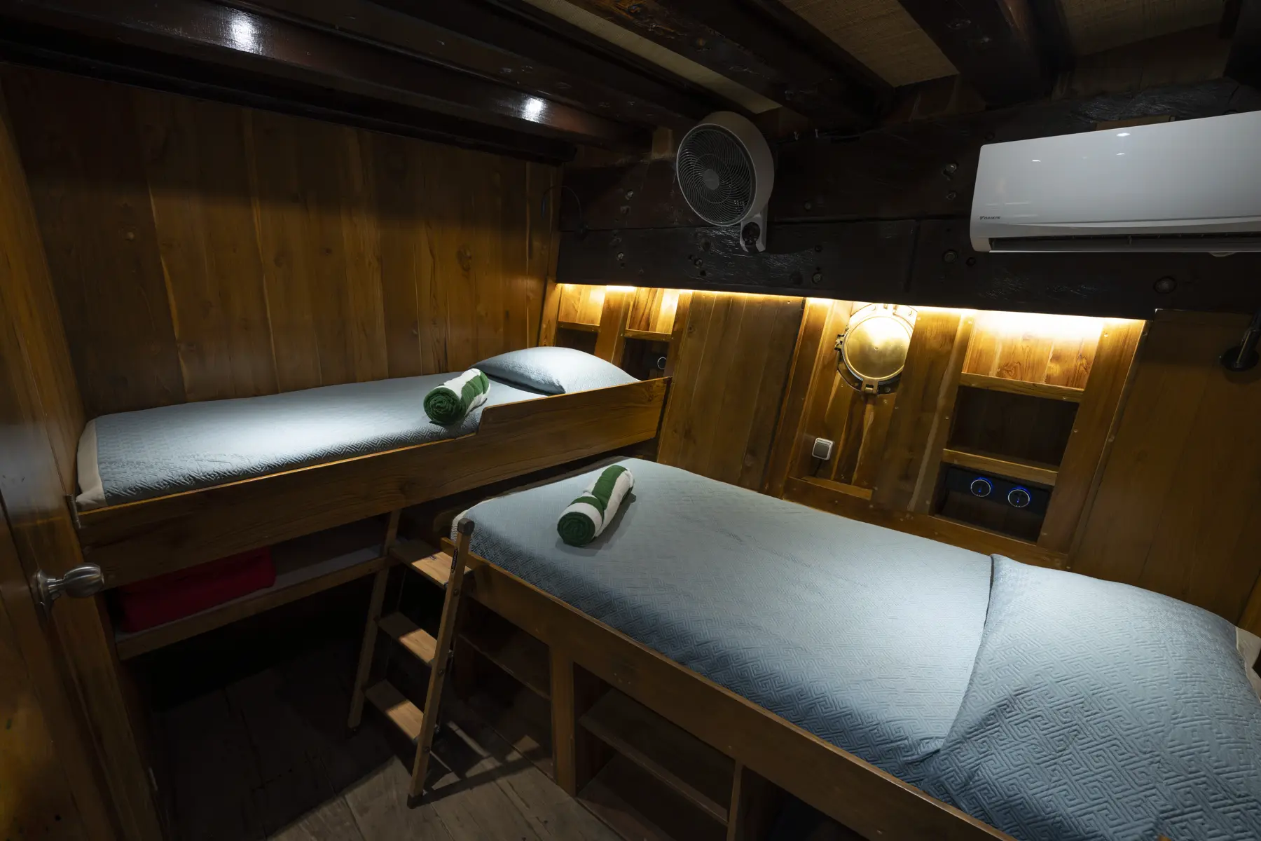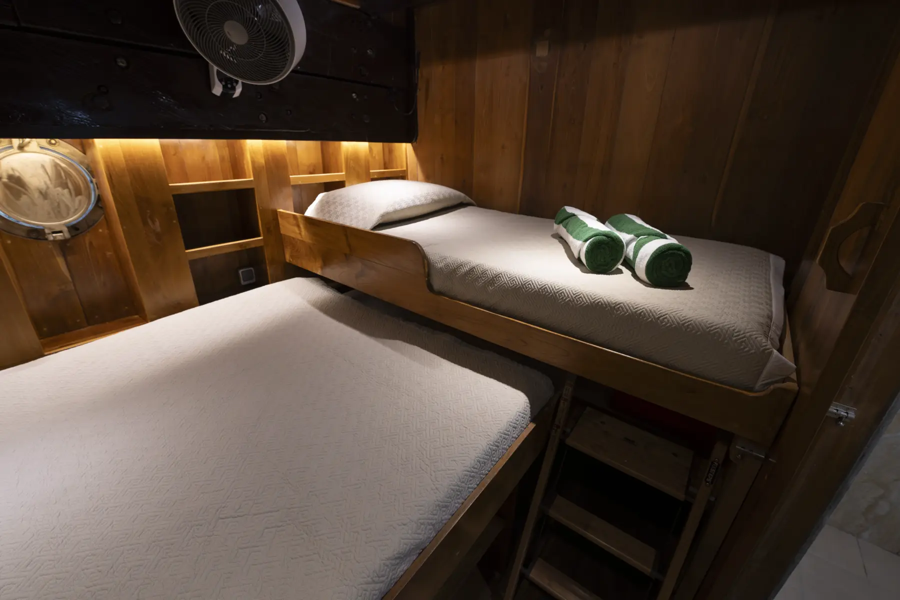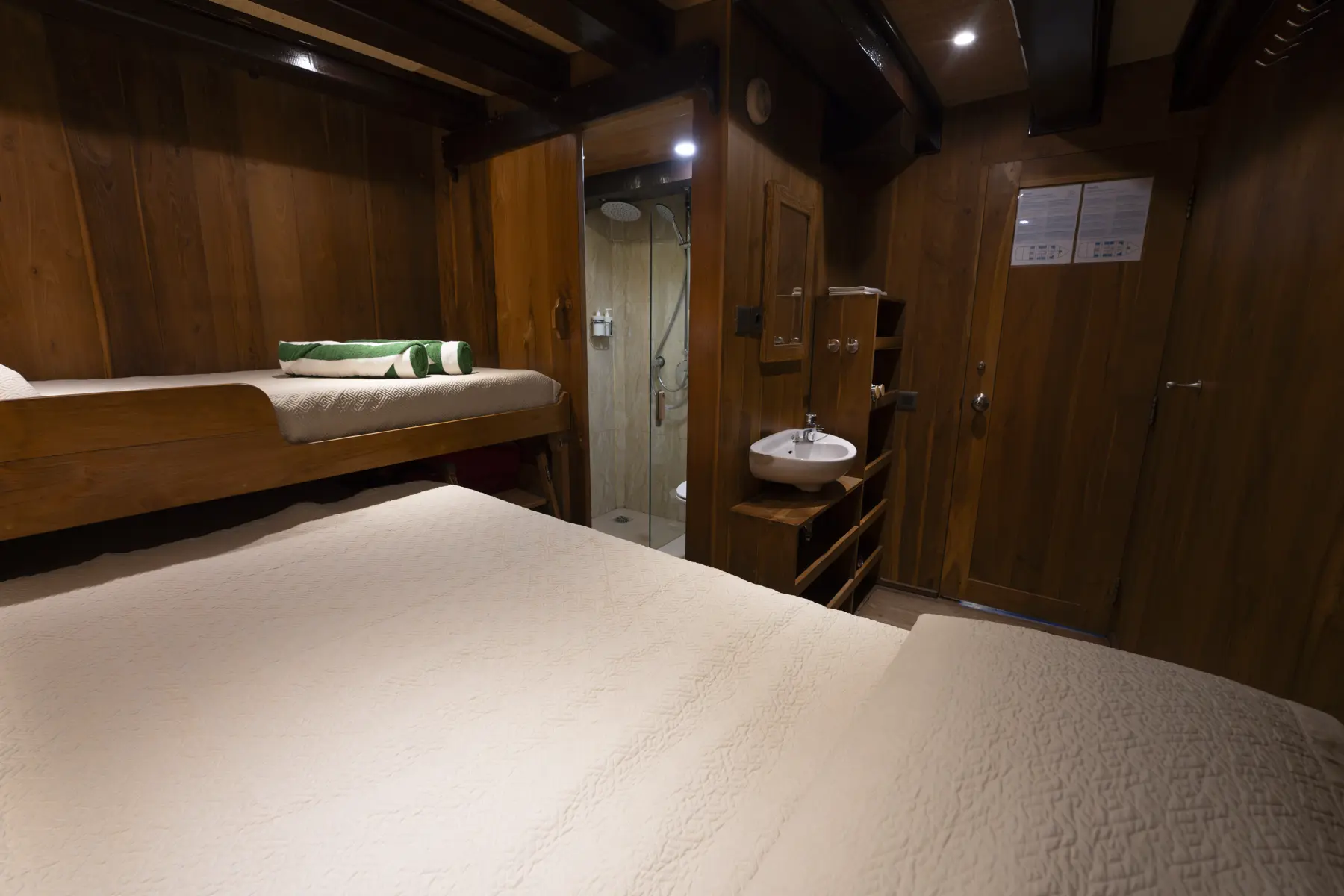 Pindito offers 8 cozy cabins blending traditional Pinisi style with modern comfort. Each cabin is air-conditioned, with a private ensuite bathroom, hot shower, and daily housekeeping. With flexible layouts, 6 convertible double/twin cabins, and 2 twin cabins, They welcome up to 16 guests, ensuring an intimate and personalized liveaboard experience. After every adventure, your cabin is the perfect retreat to relax, recharge, and wake ready for the next day at sea.