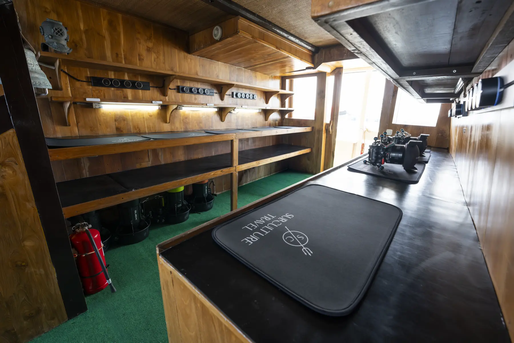 • Camera Room: Purpose-built for underwater photographers with individual workstations, lighting, and charging stations.
