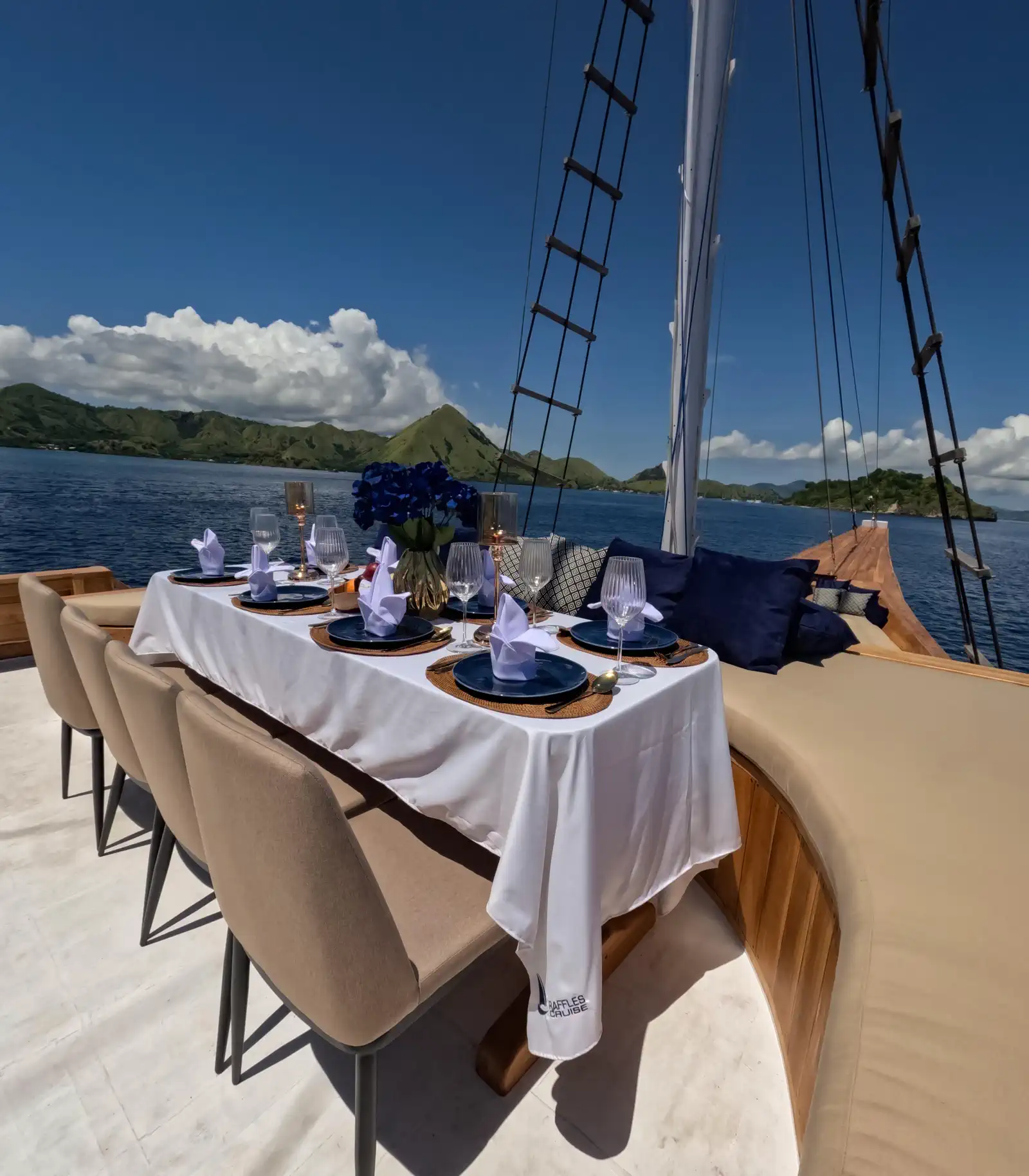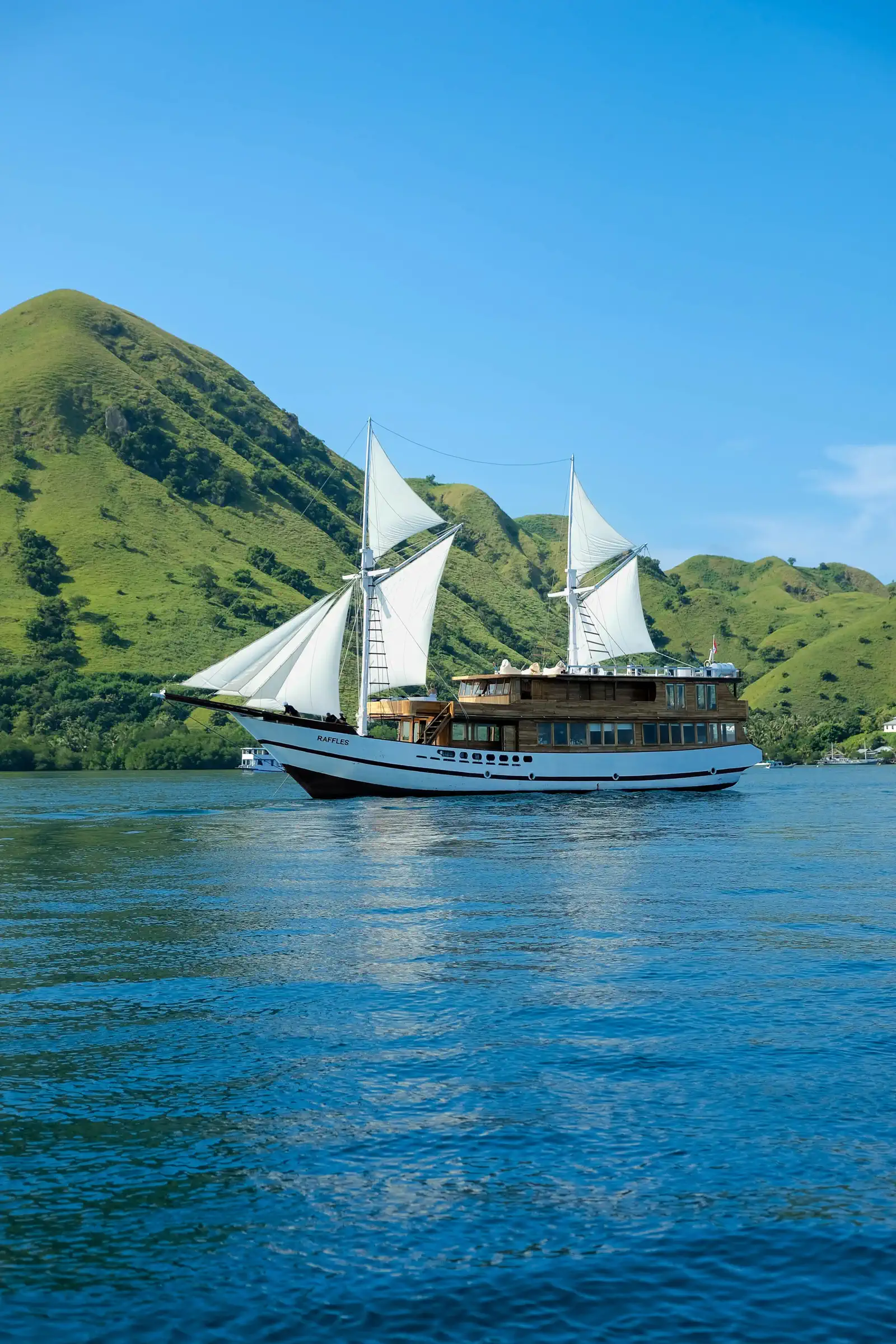 Raffles Phinisi is a 31-meter traditional wooden boat designed for unforgettable sailing trips through Komodo National Park. With four elegant cabins, it comfortably hosts up to eight guests for a relaxed and scenic journey through Komodo’s iconic waters.