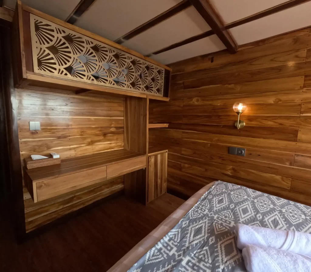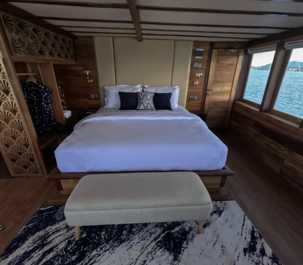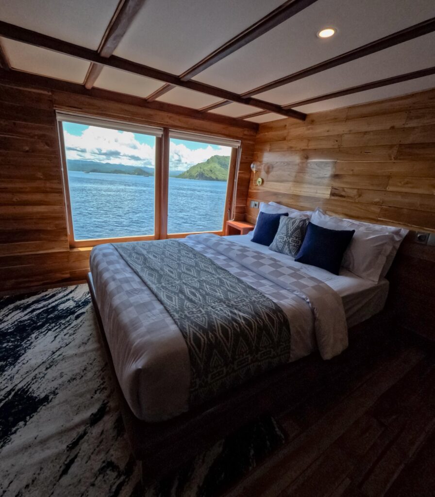 Borneo is a cozy and comfortable sea-view cabin on board Raffles Komodo, designed for two guests. Located on the top deck, it features a double bed, ensuite bathroom, air conditioning, and large windows overlooking the ocean. It’s a great option for couples or friends looking for a warm and simple space to rest between Komodo adventures.