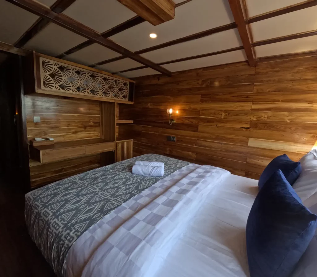Java is a warm and inviting sea-view cabin located on the main deck of Raffles Komodo. With a double bed, private ensuite bathroom, and full air conditioning, it’s a cozy retreat for two guests. Large windows bring in natural light and frame the passing views of Komodo’s tropical waters – making it an excellent choice for those who appreciate simple comfort and beautiful scenery.