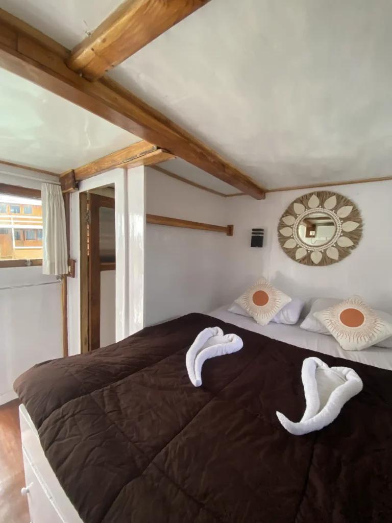 This is the brightest and most spacious cabin on board, with a double bed, private bathroom, and wraparound ocean views through wide-set windows. Located on the main deck, it offers easy access to the outdoor areas while still feeling tucked away. The simple design is clean and airy, with natural light, a built-in shelf, and a touch of local charm.