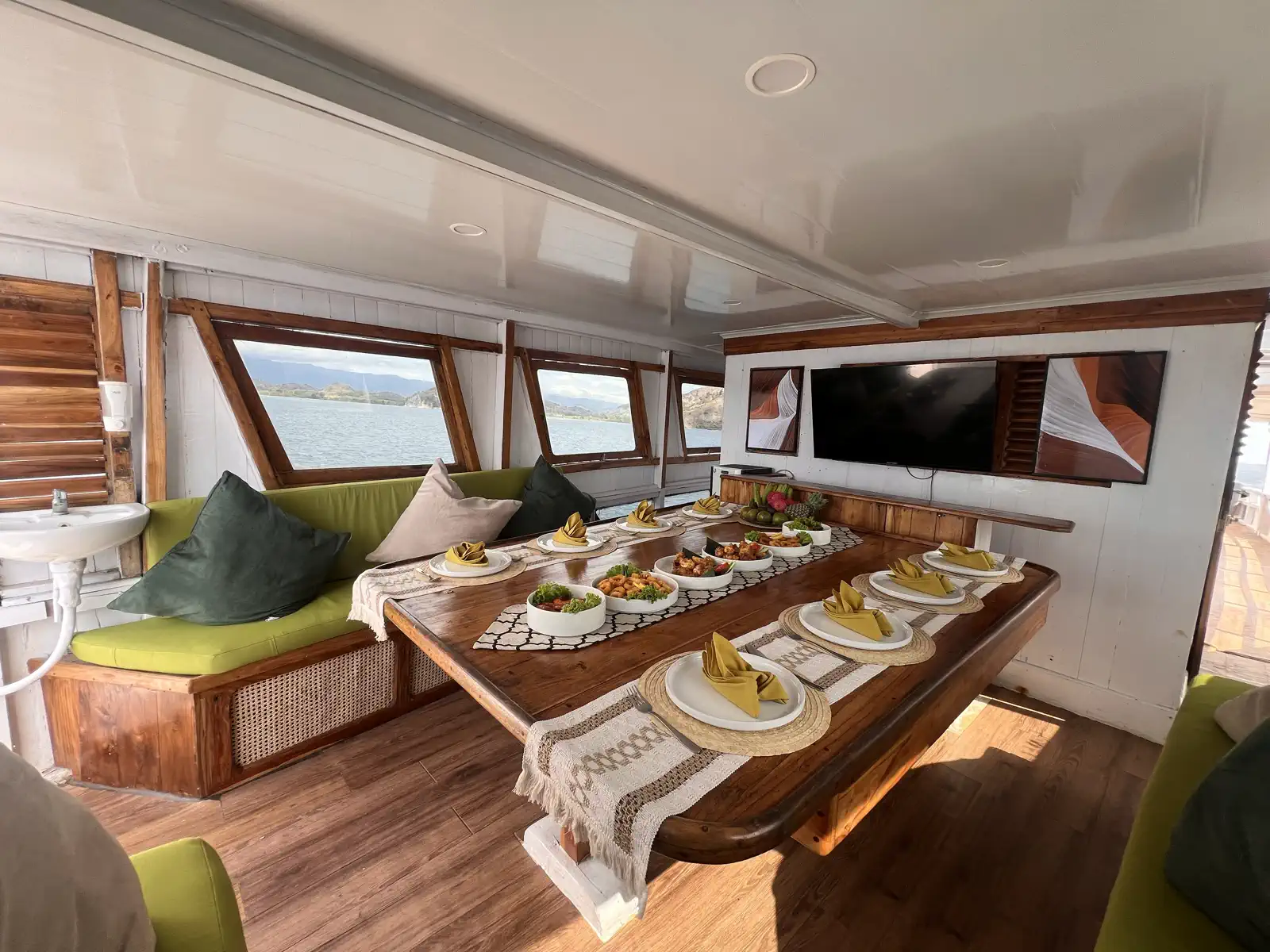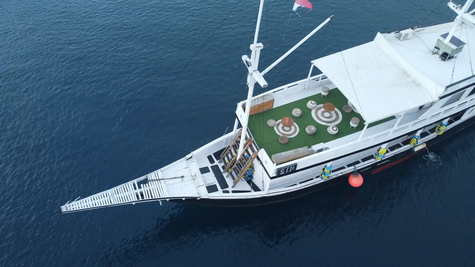SIP has space for up to 12 guests. There are four ocean-view cabins with double beds on the main deck, plus a bunk-style shared cabin on the upper deck. Each room has its own bathroom. The boat has a sun deck, a shared dining area, and a bit of music in the evenings if you’re in the mood. It’s the kind of setup that works well for groups of friends, couples, or families who just want to keep things simple.