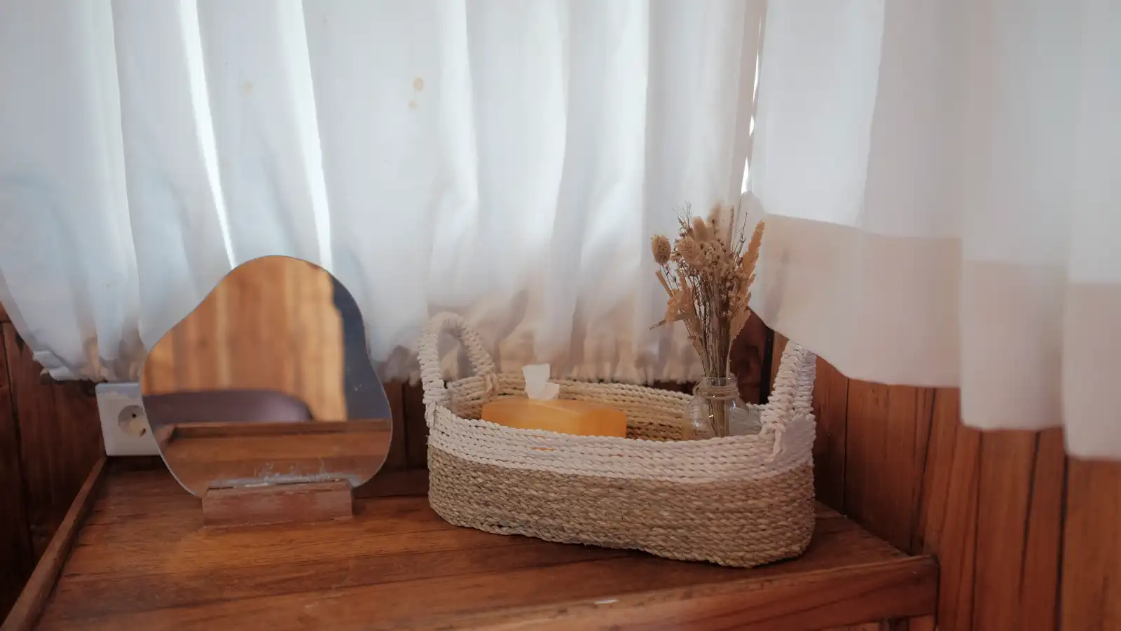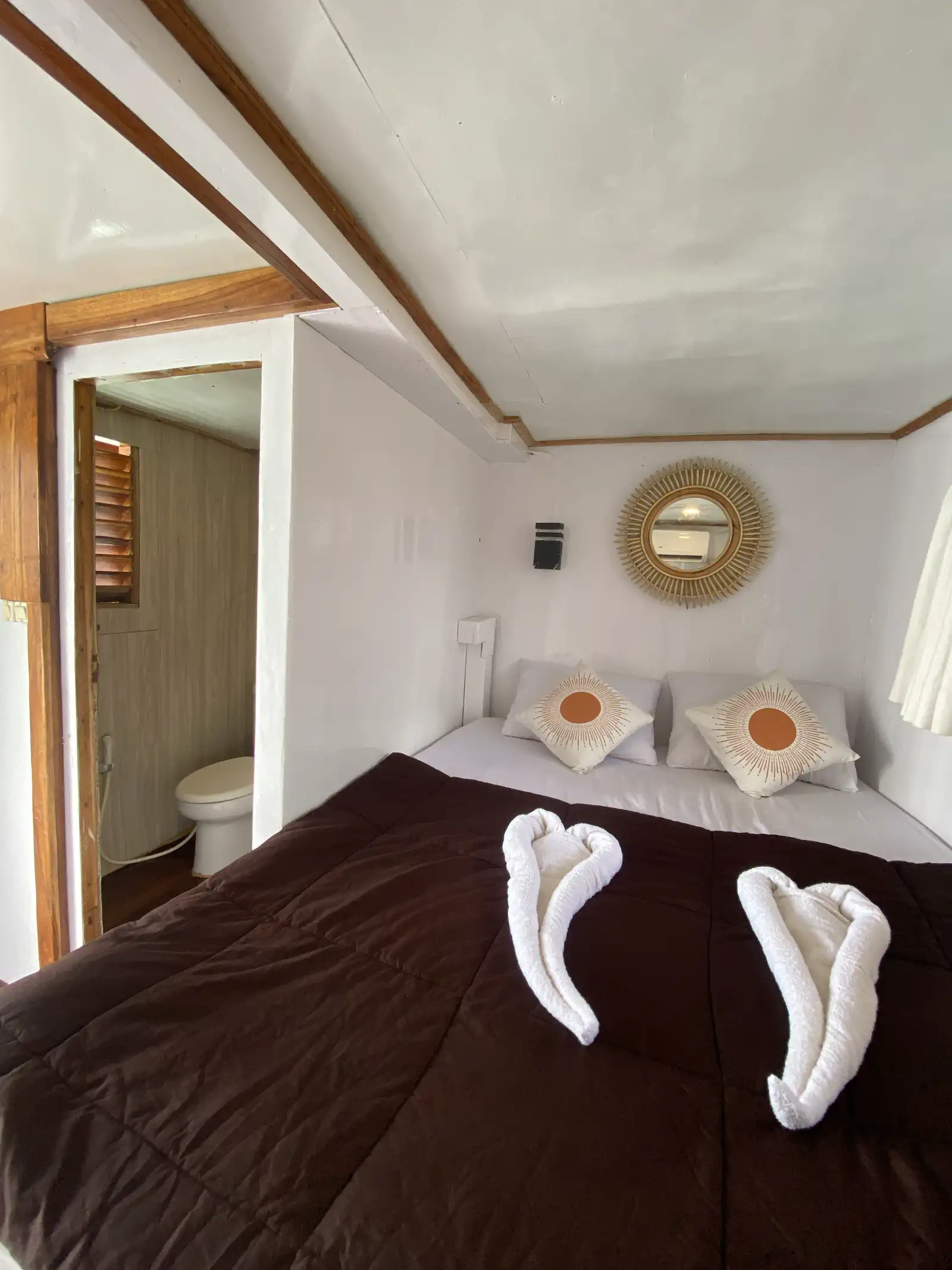 This is the brightest and most spacious cabin on board, with a double bed, private bathroom, and wraparound ocean views through wide-set windows. Located on the main deck, it offers easy access to the outdoor areas while still feeling tucked away. The simple design is clean and airy, with natural light, a built-in shelf, and a touch of local charm.
