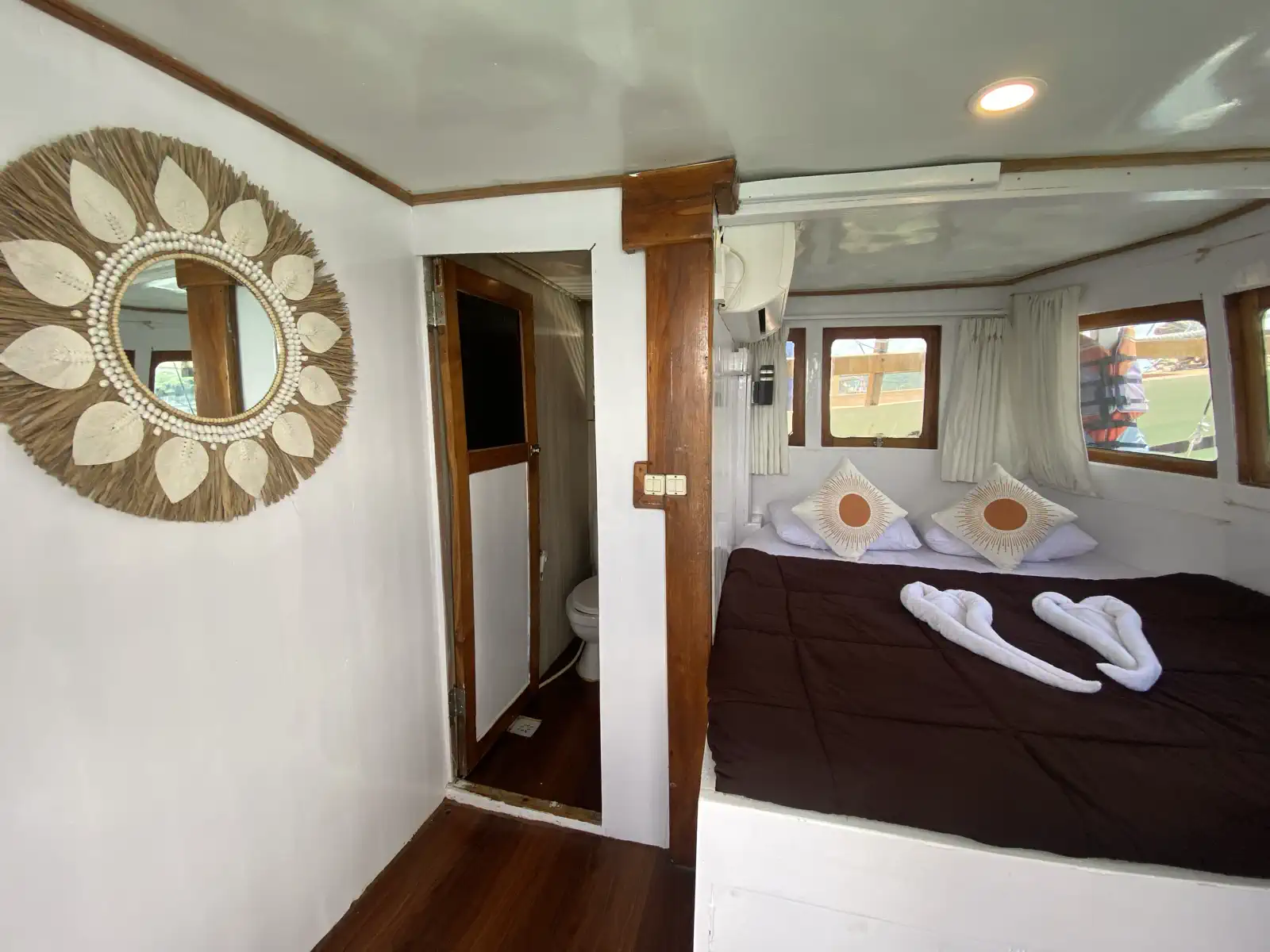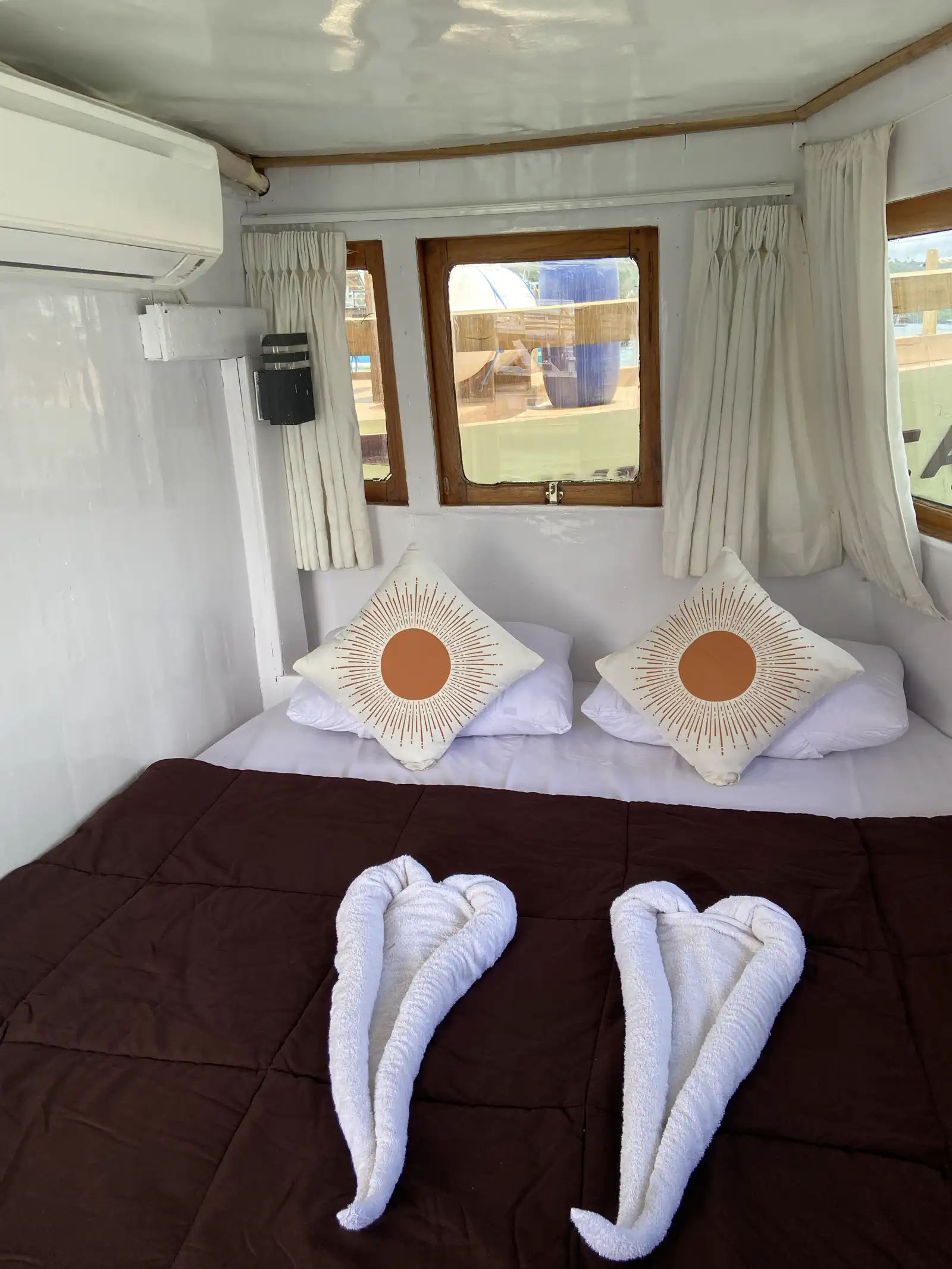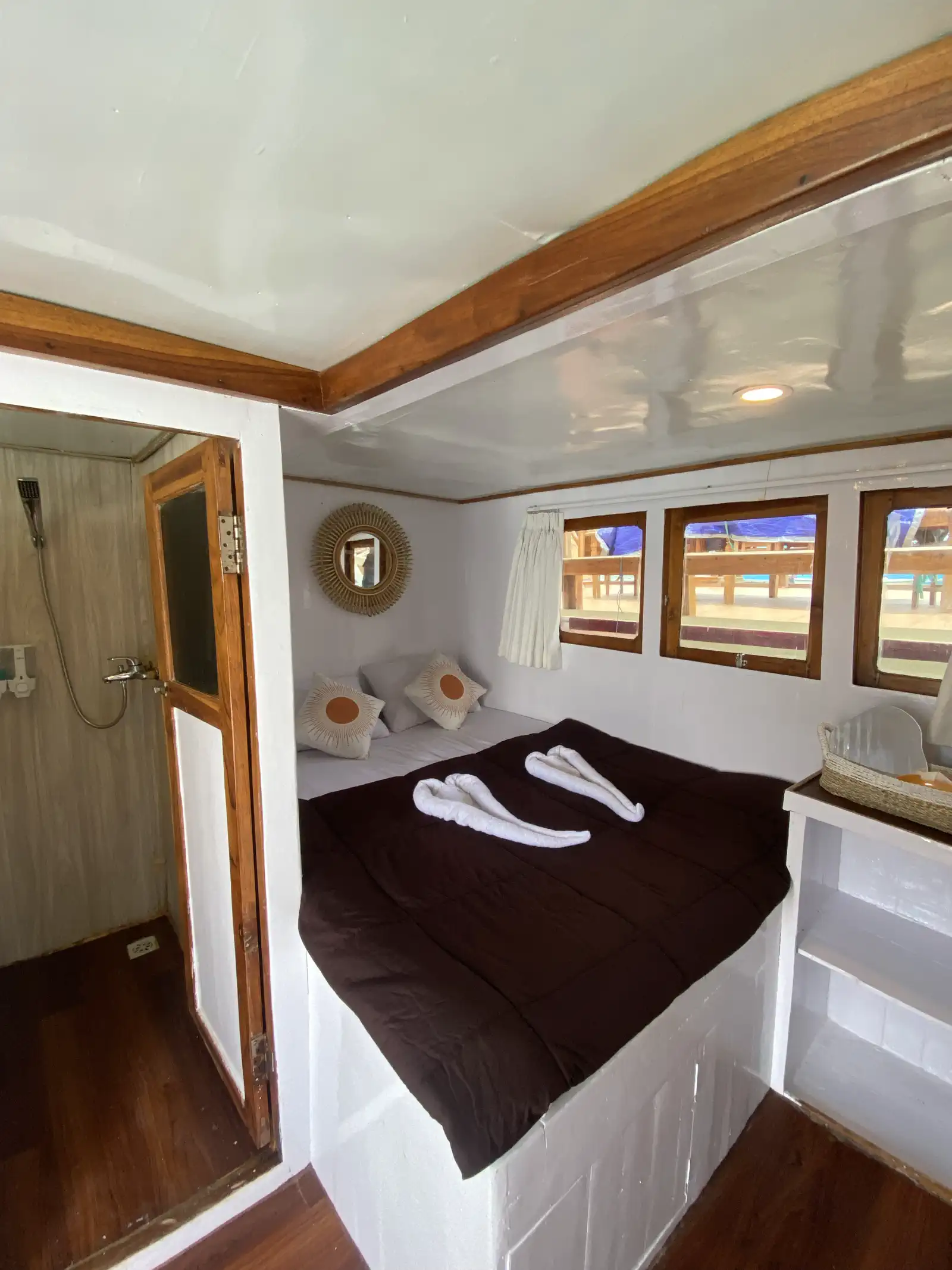 This cabin includes four single bunk beds and a private bathroom, making it a budget-friendly option for solo travelers or friends who don’t mind sharing space. With curtained windows on both sides and colorful woven accents, it’s a bright, practical spot to rest and recharge between Komodo stops.