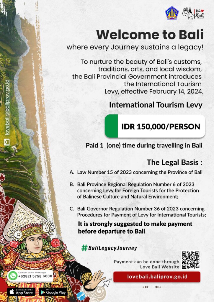 Les touristes internationaux doivent s’acquitter d’une taxe touristique de 150 000 IDR, soit environ l’équivalent de 10 USD. Cependant, tous les visiteurs étrangers ne devront pas payer cette taxe. Les exemptions s’appliquent aux titulaires de visas diplomatiques et officiels, au personnel de transport, aux titulaires de KITAS et KITAP, aux titulaires de visas de regroupement familial, aux titulaires de visas d’or et d’étudiants et aux titulaires de visas non touristiques spécifiques.
