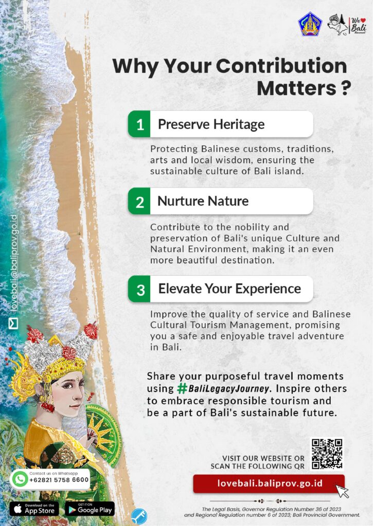 Wonderful Indonesia met l’accent sur trois domaines principaux qui montrent que cette initiative ne se limite pas à la perception de droits. Il s’agit d’un effort conscient pour protéger Bali. Le premier est de « préserver le patrimoine ». Ils affirment que la taxe sera utilisée pour « protéger les coutumes, les traditions, les arts et la sagesse locale balinaise, afin d’assurer la pérennité de la culture de l’île de Bali ».