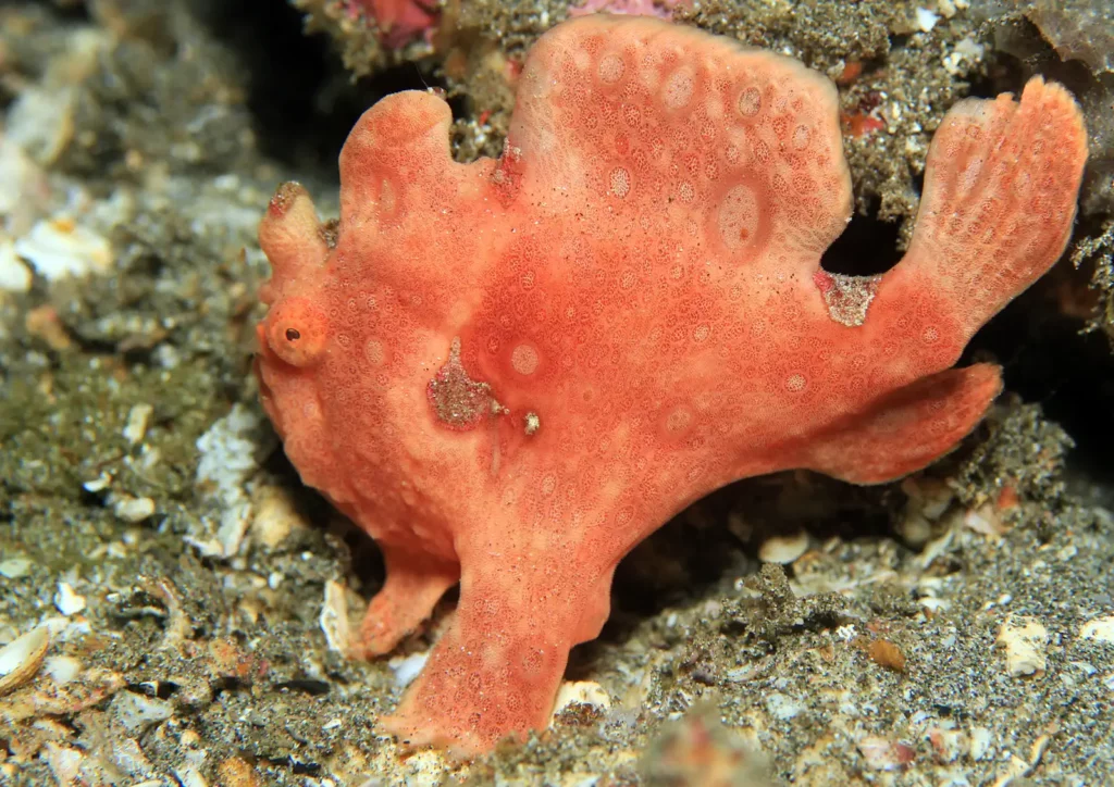 There are around 50 known species of frogfish across 14 genra (FishBase), found in tropical and subtropical seas worldwide. They usually stick to coral reefs, rubble slopes, or seagrass beds, from the shallows down to about 100 meters – well within the range of scuba diving.