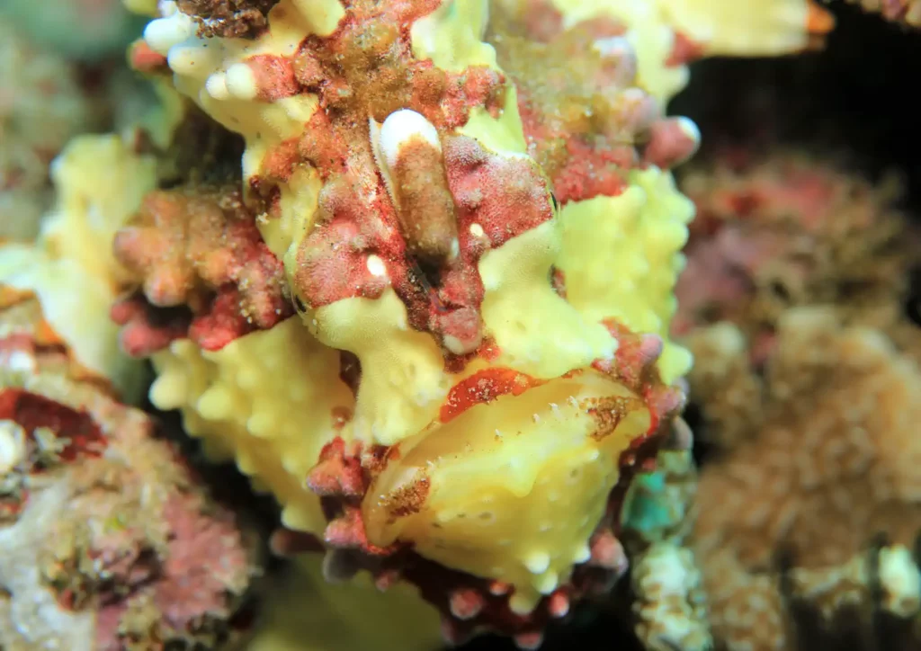 • Komodo: Giant frogfish perch motionless on barrel sponges along reef walls, blending in perfectly with the coral environment.