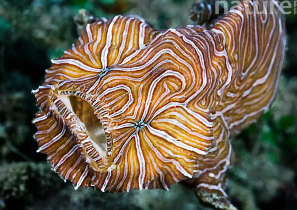 But this disguise is not just for hiding – it’s for hunting. The first dorsal spine has evolved into a “fishing rod” (illicium) tipped with a fleshy lure (esca). To passing prey, it looks like a worm or shrimp. When the prey gets close, the frogfish twitches the lure and then strikes. If the lure is lost, it regenerates (Florida Museum of Natural History).