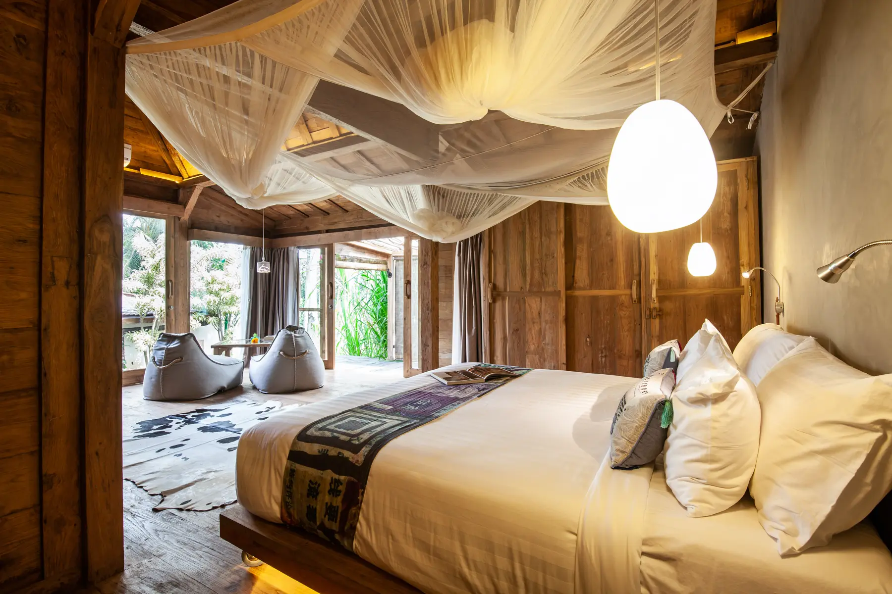 Elegant wooden interiors with private terrace and lush garden views.