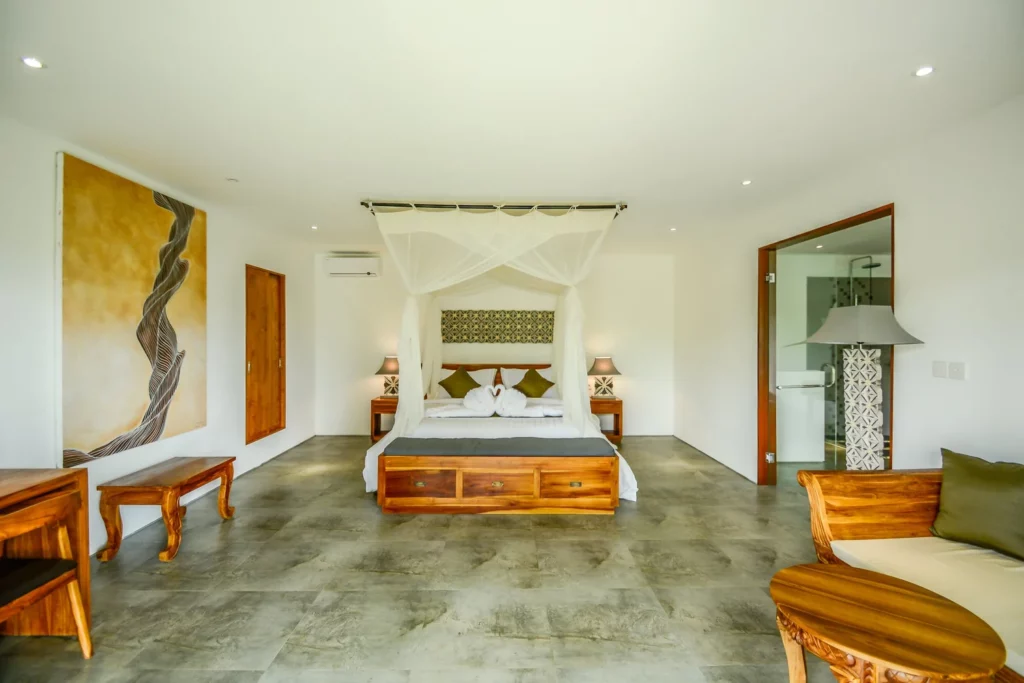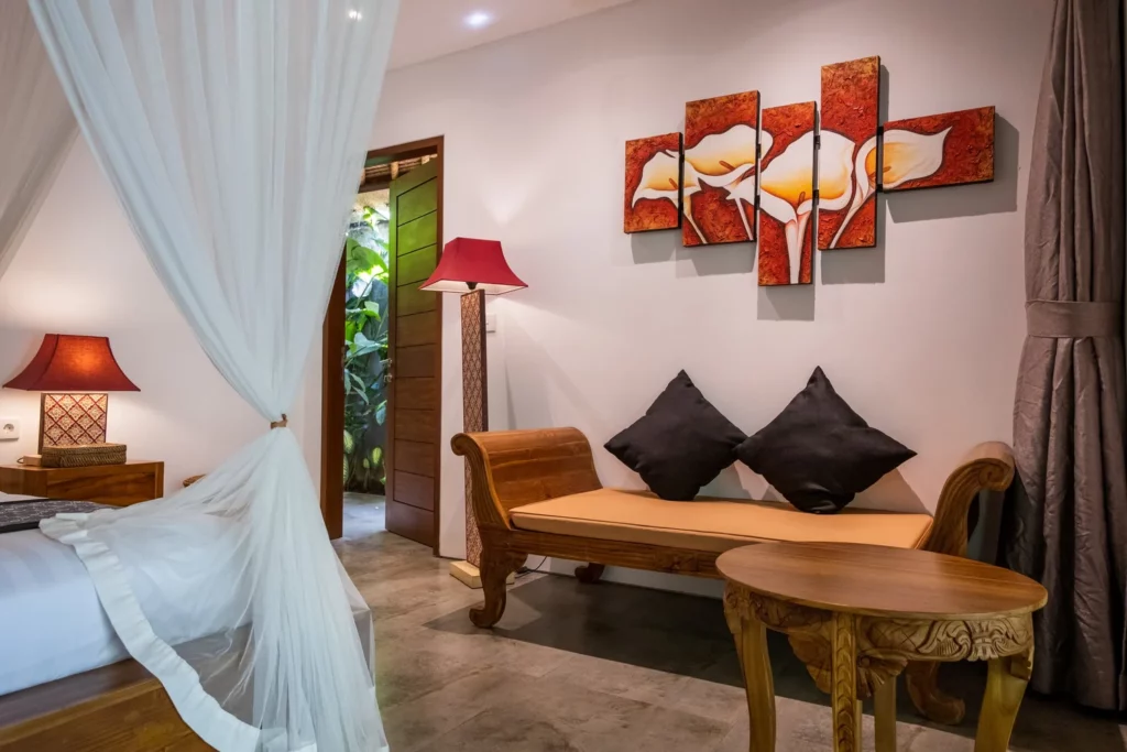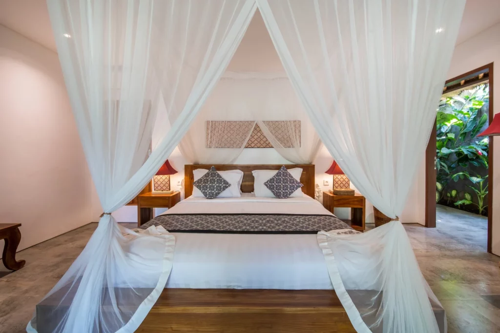 Surrounded by flowers and complete with its own private garden and pool, the Honeymoon Villa offers a spacious retreat for two. Inside, there’s a four-poster bed, a cosy living area, and a bright bathroom separated by glass doors with curtains for privacy – perfect for a secluded stay at Hidden Paradise Ubud.