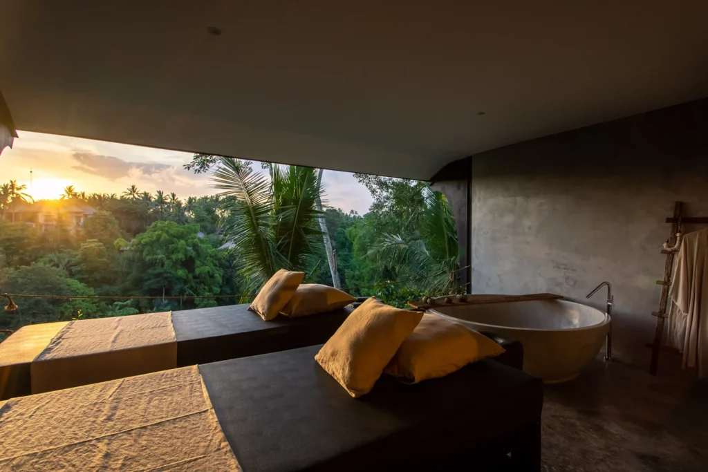 The open-air spa at Hidden Paradise Ubud sits high above the Petanu River Valley, where the sound of flowing water and the breeze set the tone for relaxation. Guests can choose from a range of massages, facials, and treatments, all enjoyed with dramatic valley views.