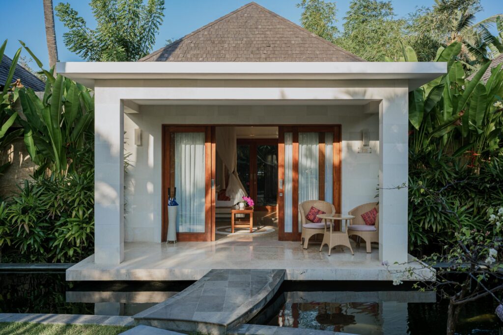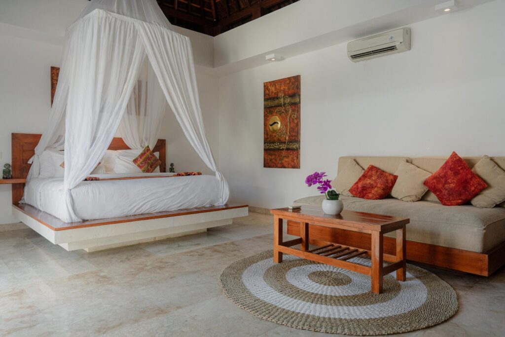 The villa includes a spacious ensuite bathroom, comfortable sleeping setup, and thoughtful in-room features like a minibar, coffee and tea station, and flatscreen TV – everything you need for an easy, intimate stay.