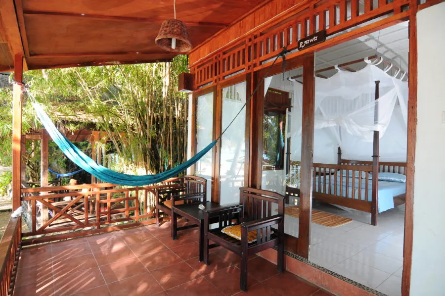 Standard bungalows are located at both the front and back of the hotel. Front bungalows offer direct sea views, while those at the back overlook a garden with banana, papaya, palm trees, and tropical flowers. Each bungalow features a private bathroom, a comfortable bed (double, twin, or double plus single), basic furniture, and a mosquito net. They also include a spacious front veranda with chairs and a table. These bungalows are suitable for solo travelers, groups of friends, or couples.