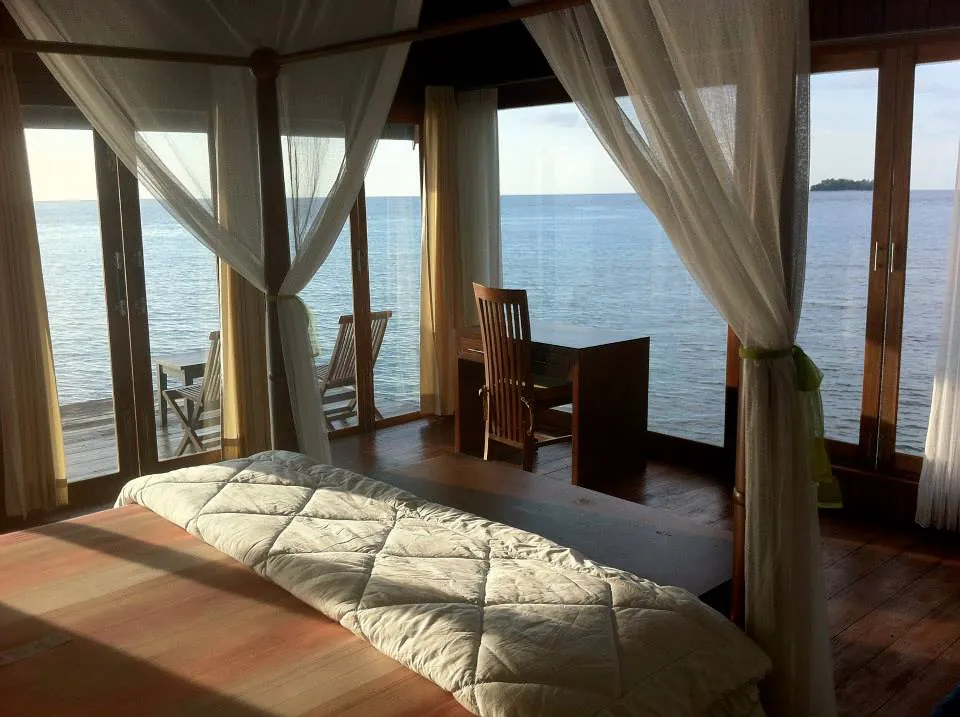 The Sea Villas are situated over the clear waters in front of the hotel. Each villa features a spacious veranda for sunset views, large windows, and a king-size bed with a mosquito net. They also include a private bathroom, a wardrobe, and a sitting area with a sofa and chairs. The Sea Villas are perfect for those seeking a romantic escape in a tropical paradise.