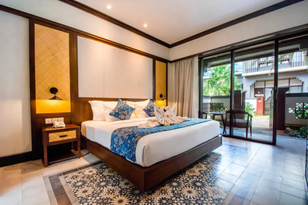 These Deluxe Garden Rooms offer a private balcony or terrace, where the vibrant greenery of the surrounding landscape provides a peaceful soothing backdrop for relaxation. This room has a king-size bed, an en-suite bathroom, a 43″ LCD TV, a safety box, and a tea and coffee maker.