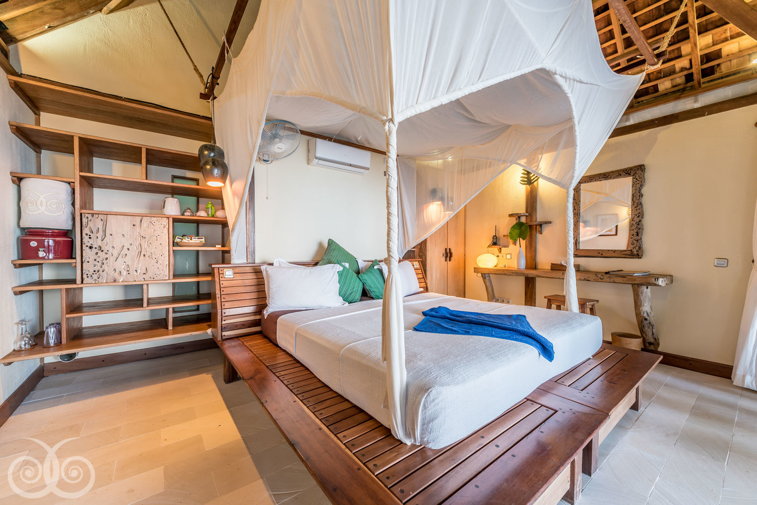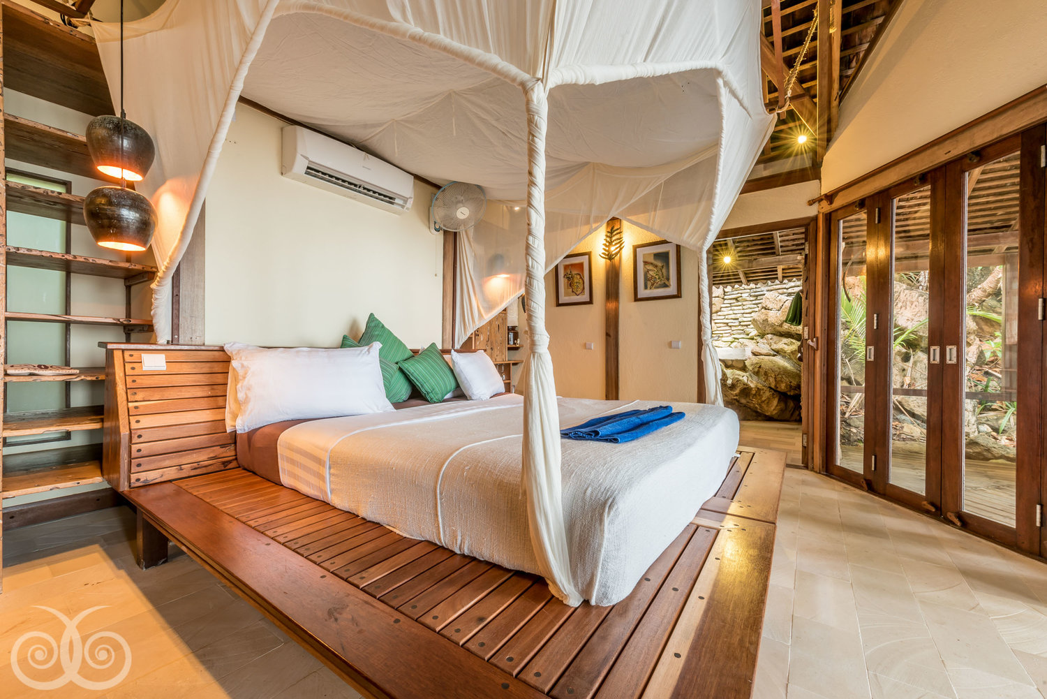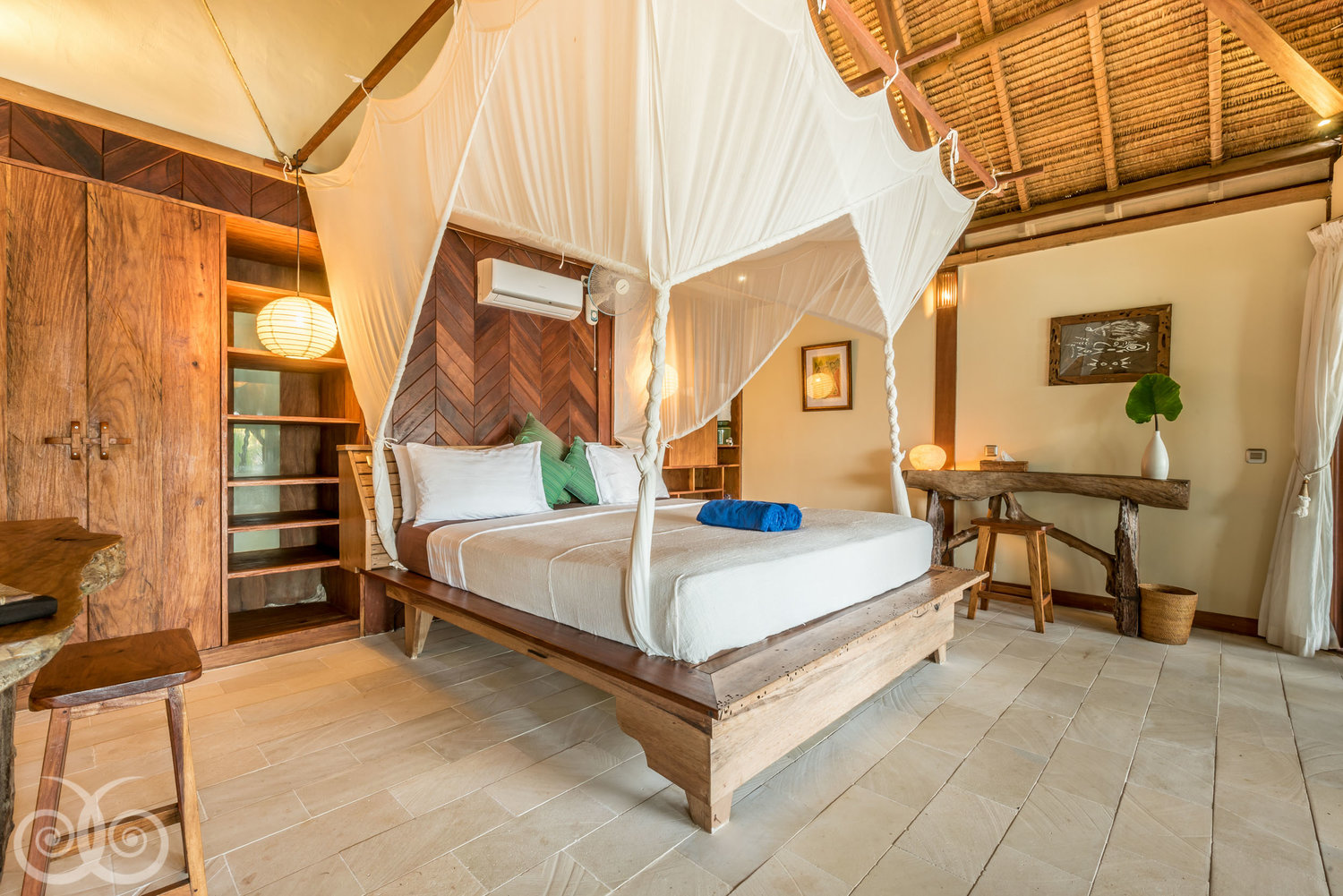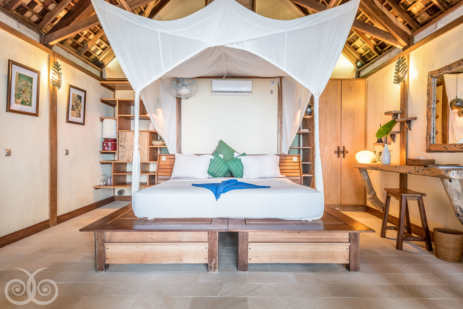 The rooms are designed for your comfort, privacy, and the environment. They’re spacious and well-ventilated, scattered around our private island’s unique rocky landscape. You’ll love the Balinese-style open-air bathrooms, wall fans, and air-conditioning units. Enjoy refreshing hot and cold showers, mini-bars full of local treats, and handcrafted furniture.