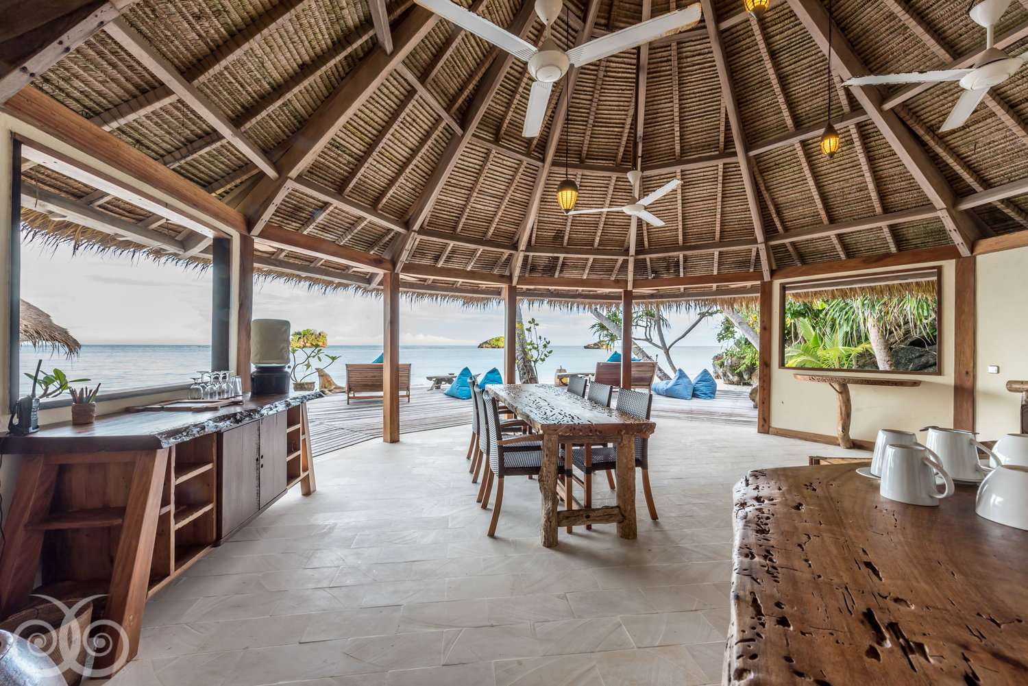 Nestled by the beach with a view of the North Lagoon, you’ll find the restaurant. Its charming round roof, set beneath swaying coconut palms, provides a cool escape from the midday sun. For a tranquil evening, head to the roomy terrace – perfect for relishing a sunset cocktail or a bottle of wine, all while observing baby sharks and long toms chasing swirling sardine schools. Whether you’re a couple seeking intimacy or part of a travel group, the dining spaces offer plenty of seating. Plus, mealtime options are staggered based on the number of guests.