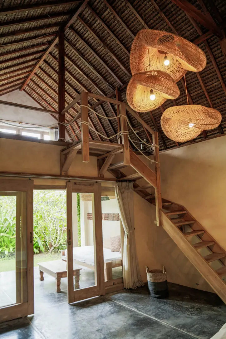 Family bungalow at Owa is the perfect retreat for up to four guests, making it ideal for families or groups of friends. It features a king bed downstairs and two twin beds on the mezzanine, along with an outdoor bathroom with a sky shower. Enjoy a spacious terrace just steps from the pool, providing everything you need for a comfortable stay in the beautiful Areguling countryside.