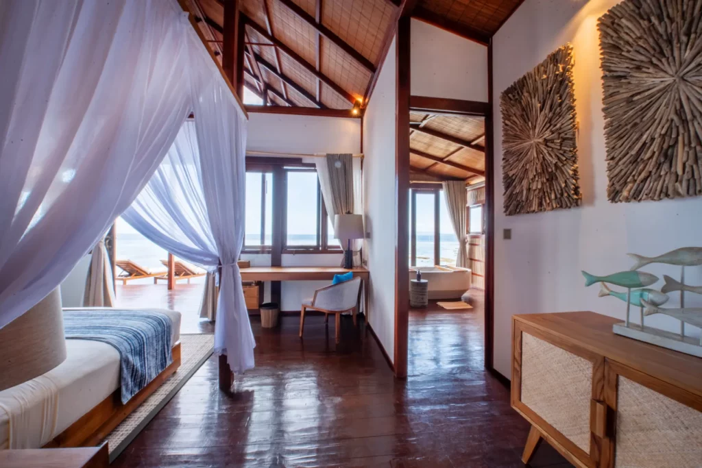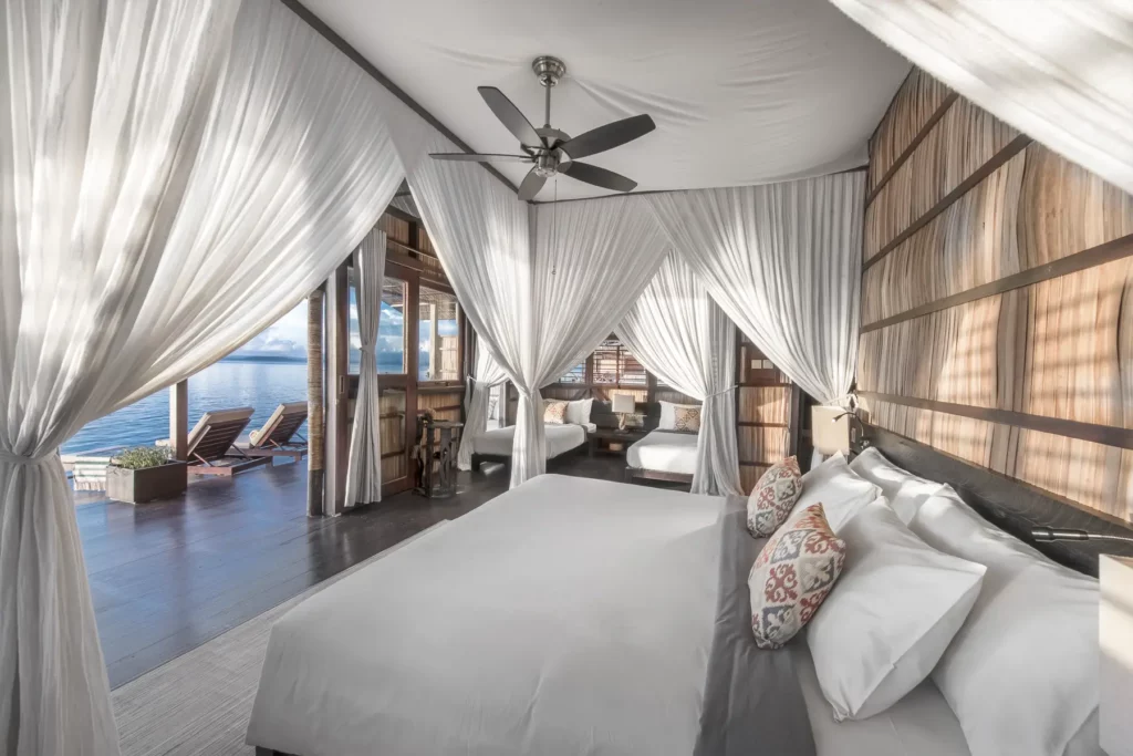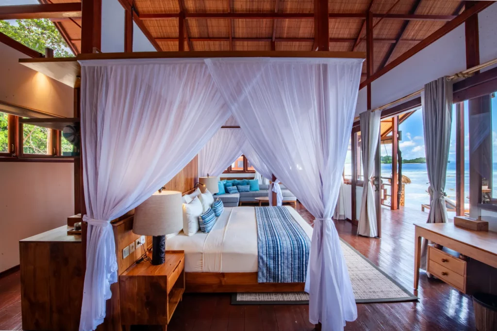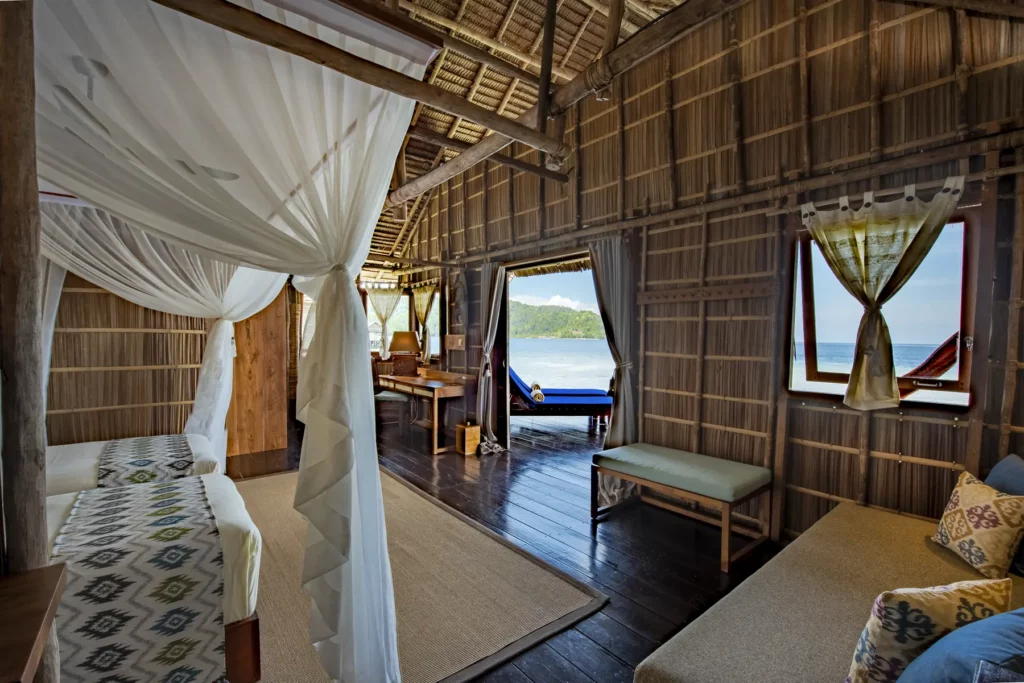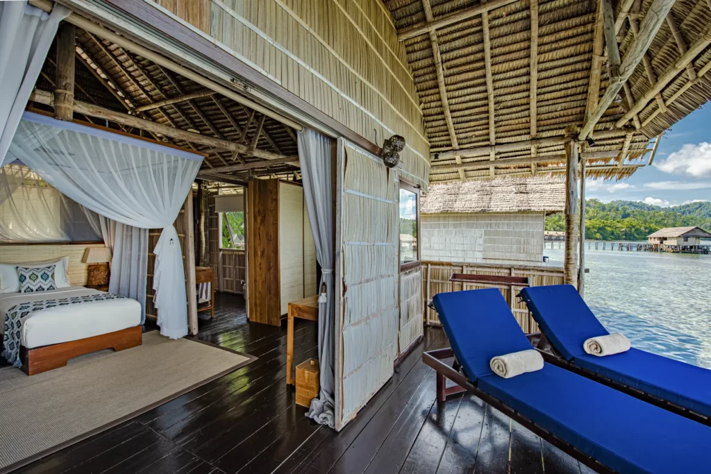 Papua Paradise offers a high-quality standard of comfort and service. The accommodations have 26 over-water bungalows with a spacious balcony overlooking the turquoise reefs and Pacific Ocean. Each room has a safety deposit, pedestal fan, mosquito net, ocean view desk, and daybeds on a balcony. Enjoy additional complimentary services like a welcome drink, face towel on arrival, coffee or tea, evening turn-down, and bottled drinking water from the accommodation.