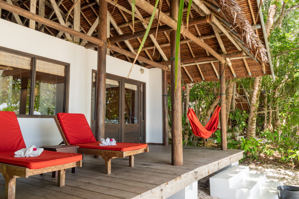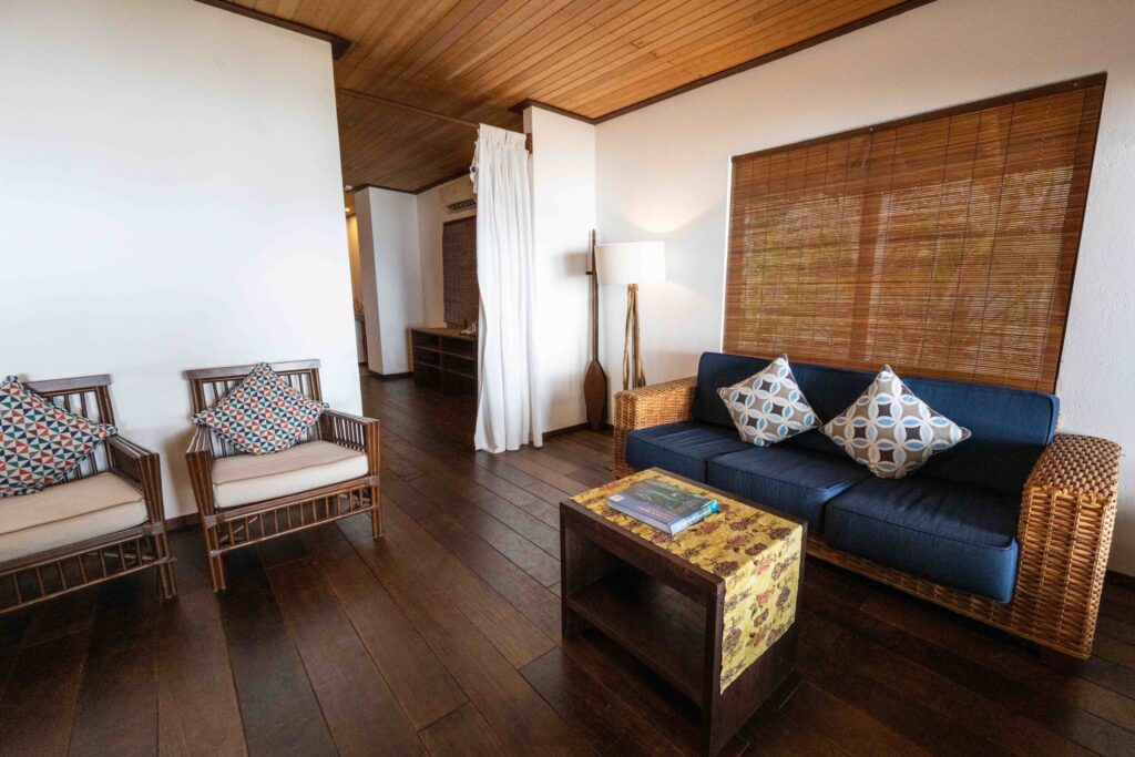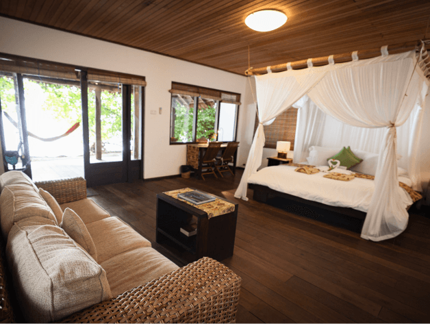 The Kaimana Bungalow is spacious and versatile, making it ideal for families, groups of friends, or two couples traveling together. With a larger floor plan that includes a separate living room, private terrace, AC, and en-suite bathroom, it offers comfort with plenty of breathing room. A built-in camera and gear workstation makes it perfect for divers and photographers, while its serene setting overlooking the lagoon or ocean ensures a relaxing island escape.