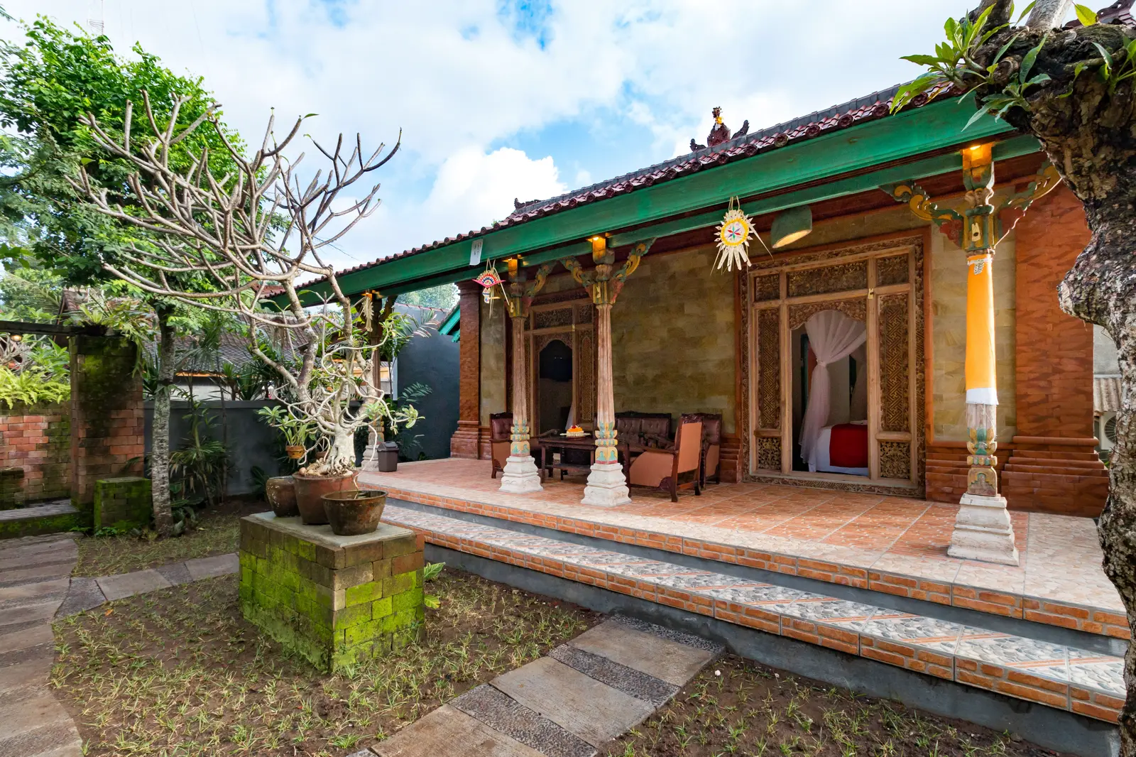 Experience authentic Balinese charm in this cozy 30 m² room featuring a large double bed and serene garden and courtyard views. Complete with air conditioning, a private bathroom, soundproofing, and a peaceful patio. Relax on the terrace and enjoy comfort and tranquility at its finest.