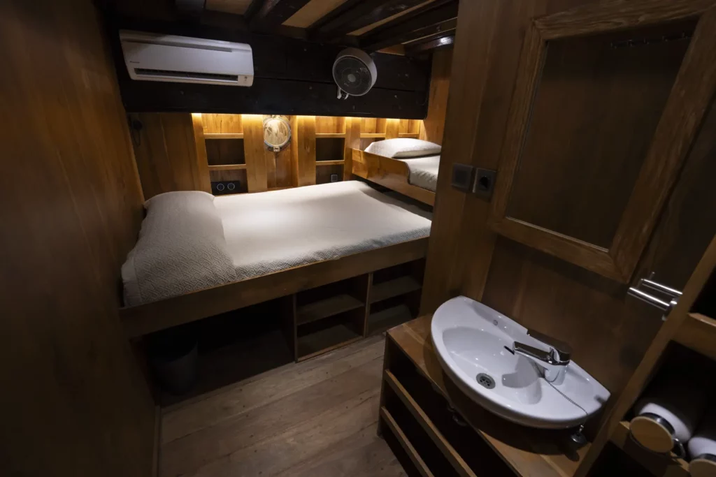Pindito offers 8 cozy cabins blending traditional Pinisi style with modern comfort. With flexible layouts, 6 convertible double/twin cabins, and 2 twin cabins, they welcome up to 16 guests, ensuring an intimate and personalized liveaboard experience.