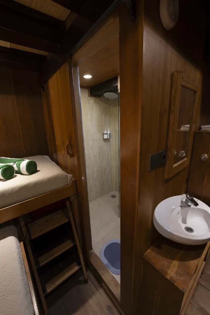 Pindito offers 8 cozy cabins blending traditional Pinisi style with modern comfort. Each cabin is air-conditioned, with a private ensuite bathroom, hot shower, and daily housekeeping. With flexible layouts, 6 convertible double/twin cabins, and 2 twin cabins, They welcome up to 16 guests, ensuring an intimate and personalized liveaboard experience. After every adventure, your cabin is the perfect retreat to relax, recharge, and wake ready for the next day at sea.