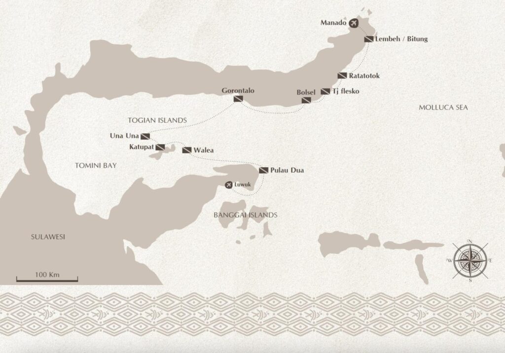 Departing from Bitung, this cruise explores the stunning East coast of Sulawesi, with unforgettable dives in Ratatotok, Tanjung Flesko, and Gorontalo – home to dramatic walls and the chance to encounter whale sharks. Continue on to the remote beauty of the Togian Islands, with world-class sites around Una Una. The final days are spent diving some of the most pristine and rarely visited reefs in Central Sulawesi, before ending the trip in Luwuk.