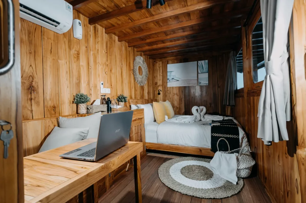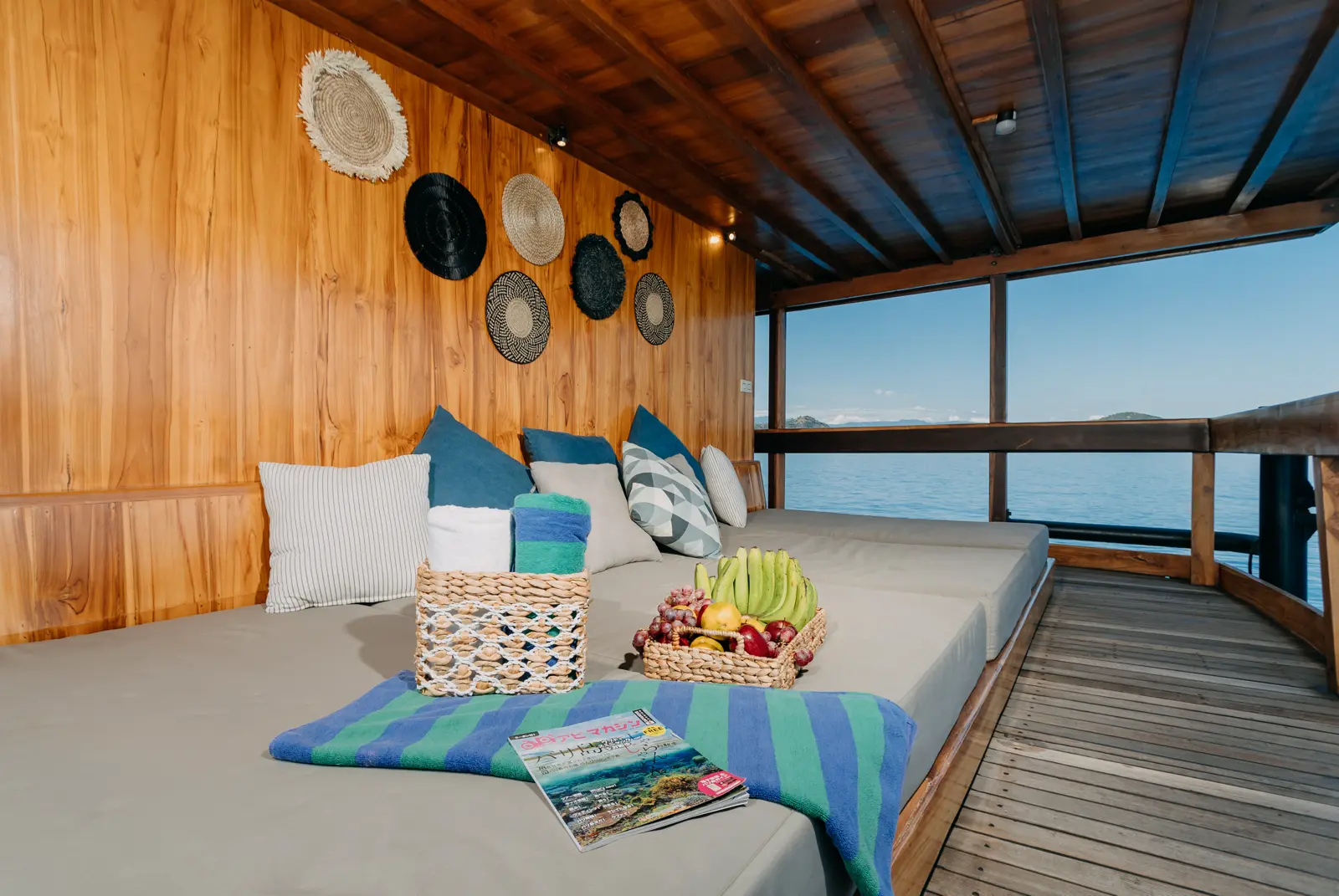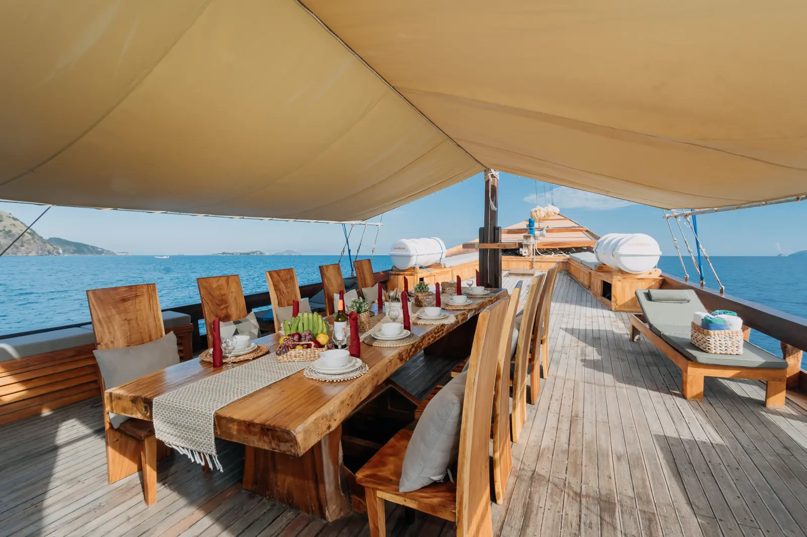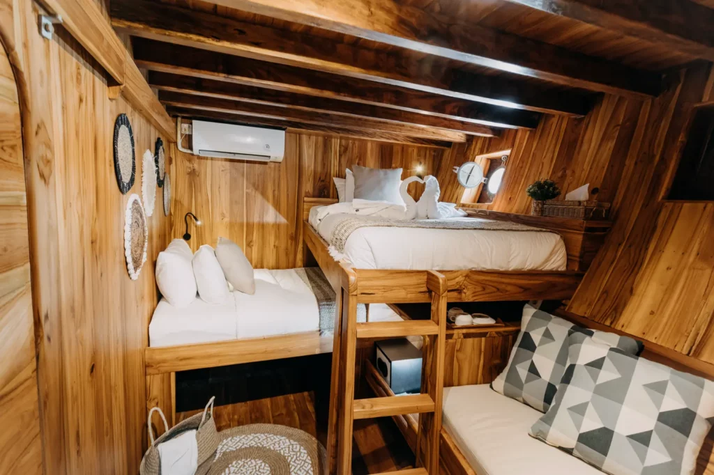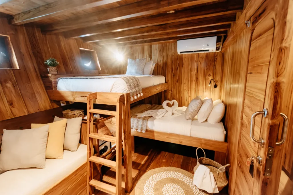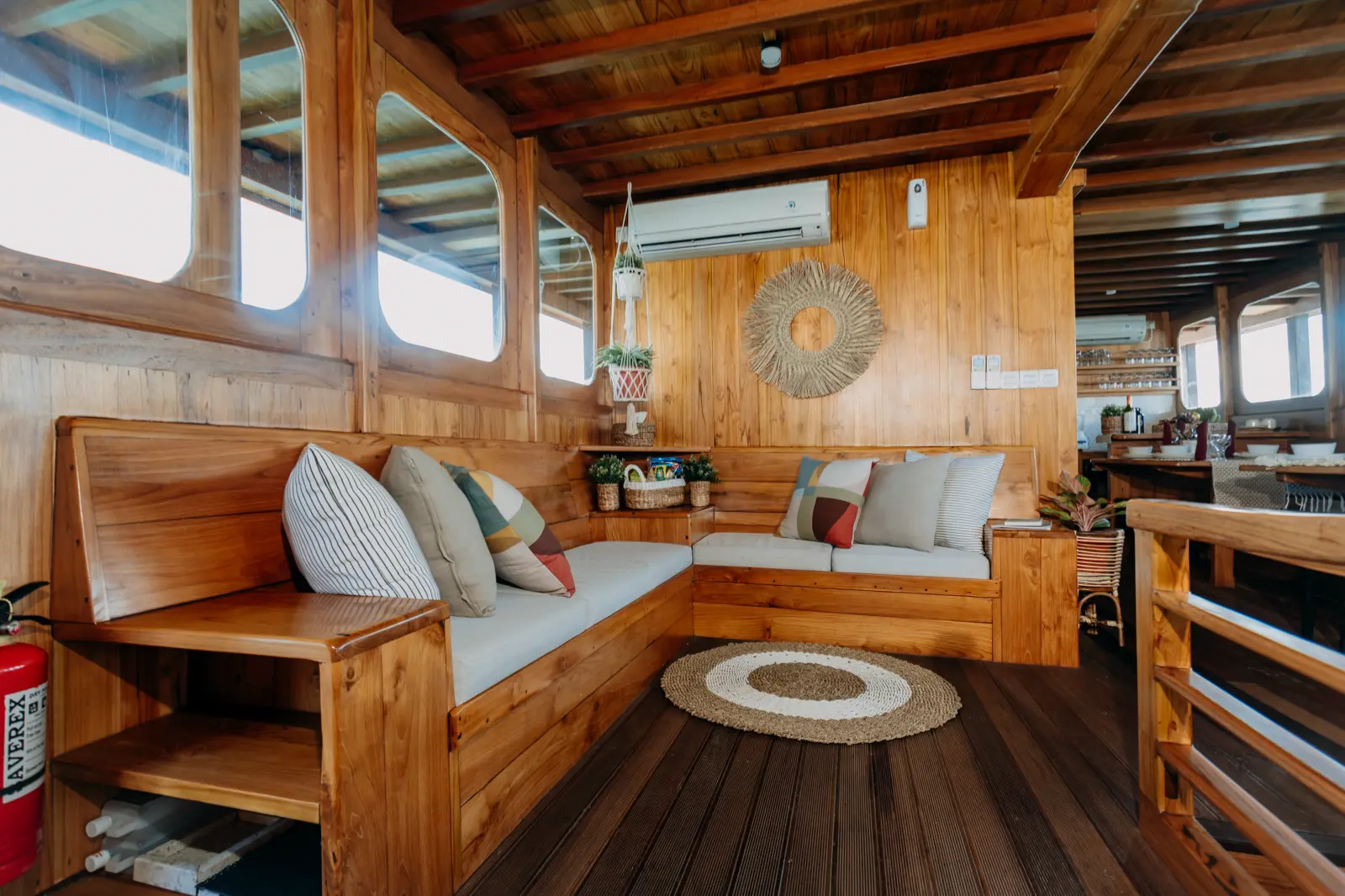 The boat features 2 double rooms on the 3rd deck and 4 twin-bed cabins on the first deck, all equipped with air conditioning, ensuite bathrooms, and hot water. Guests can relax in a spacious outdoor area, an indoor dining and lounge area, a bar, and 3 sundecks with comfy sofas and bean bags. With 9 friendly crew members onboard, you’ll enjoy exceptional service throughout your trip.
