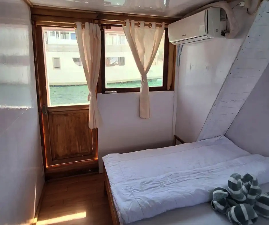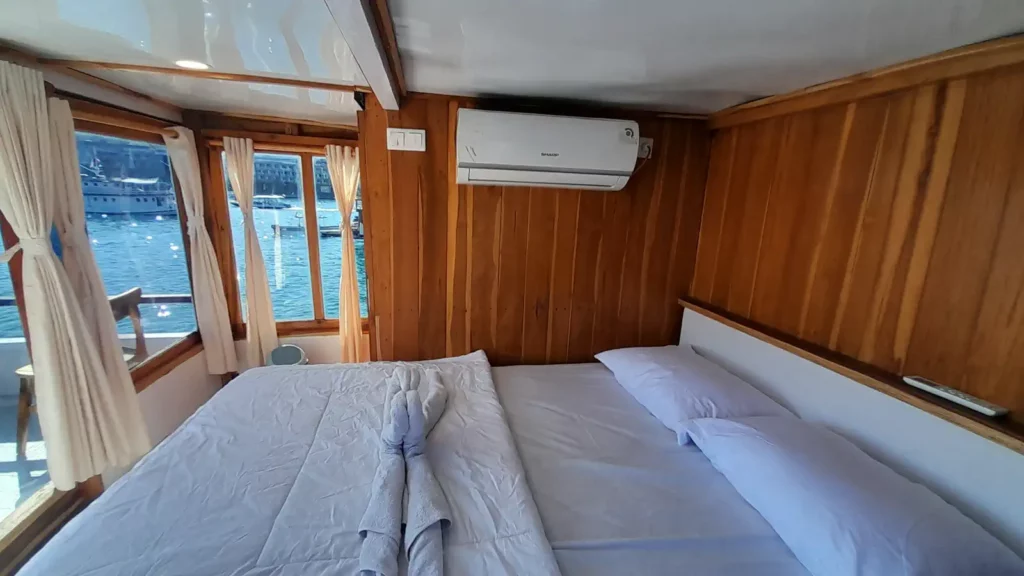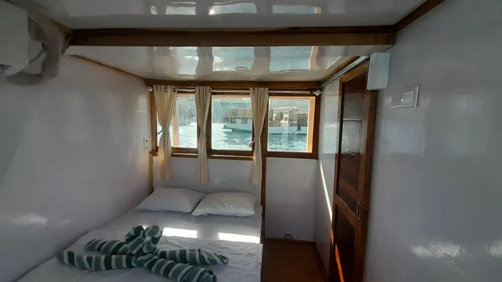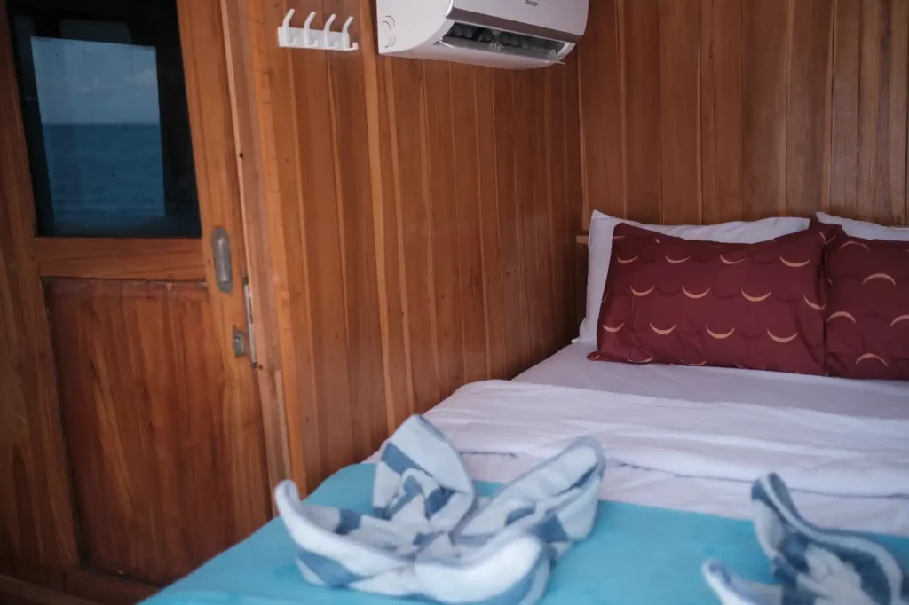 The Double Cabin is designed for comfort and simplicity, featuring a private balcony with sea views, a double bed, and an ensuite bathroom with shower and toilet. With air conditioning, fresh towels, and practical amenities like electric plugs and bed covers, it’s a cozy option for couples or friends who want a private space to relax after exploring Komodo National Park.