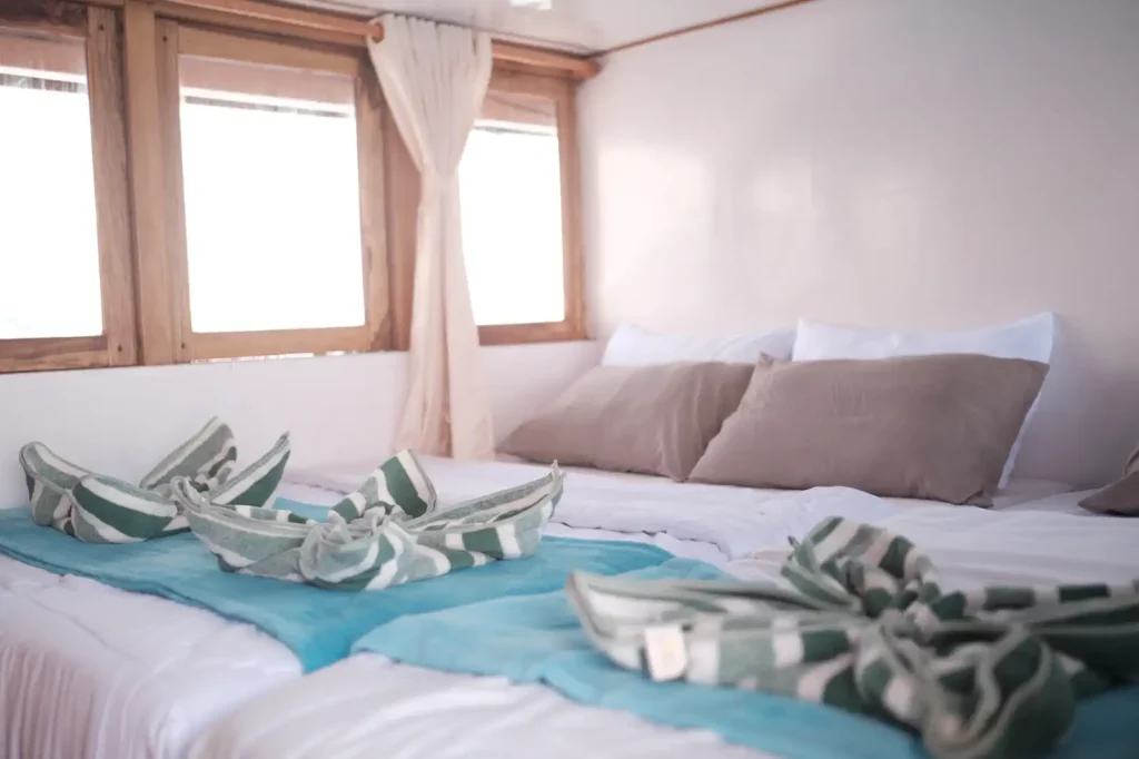 The Sharing Cabin is ideal for groups of friends or budget travelers who don’t mind a social setup. With two single bunks and two double bunks, it can accommodate up to five people in one room. An ensuite bathroom and air conditioning add comfort, while the shared layout makes it the most affordable way to join an Asterix liveaboard adventure in Komodo National Park.