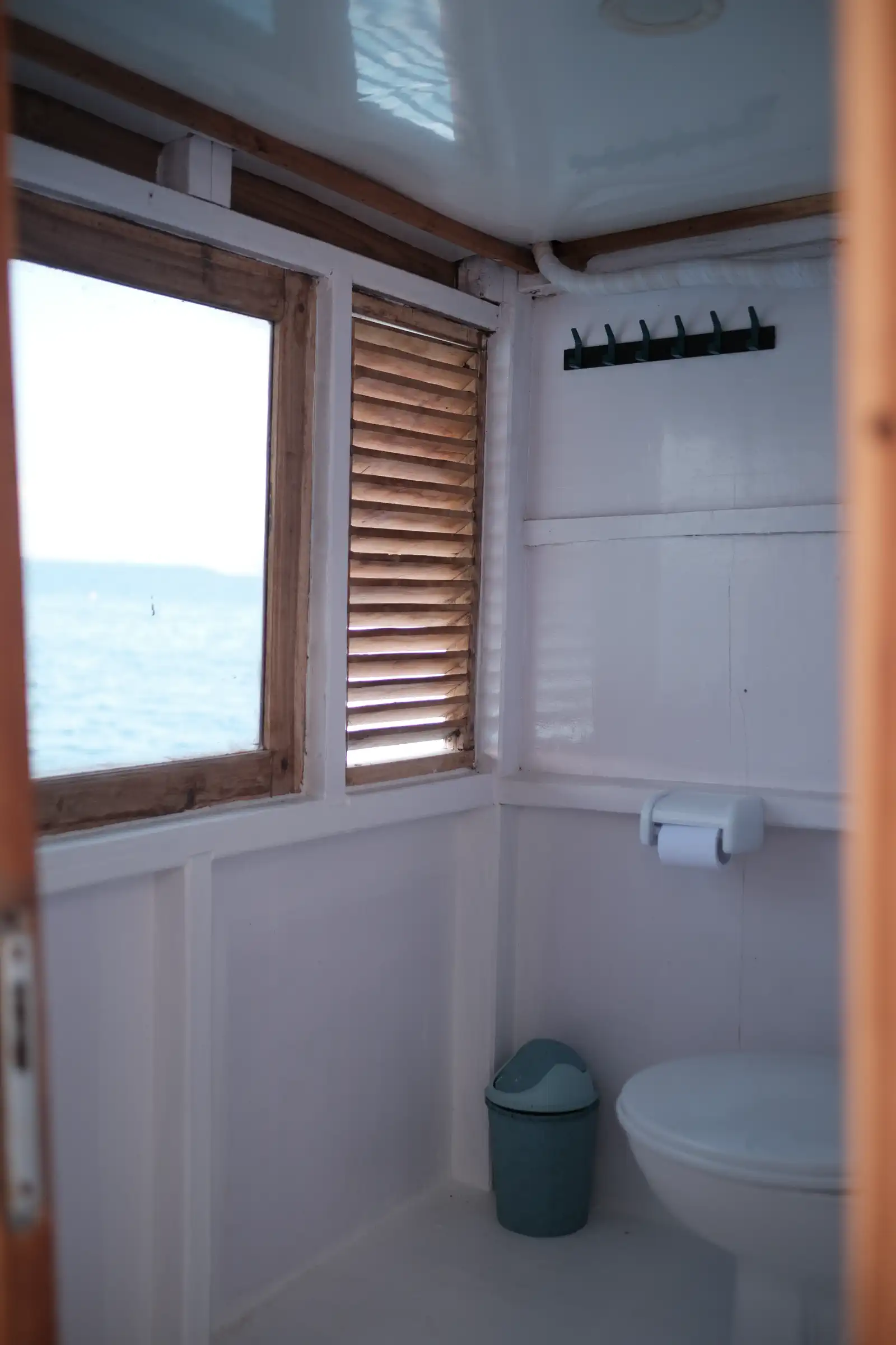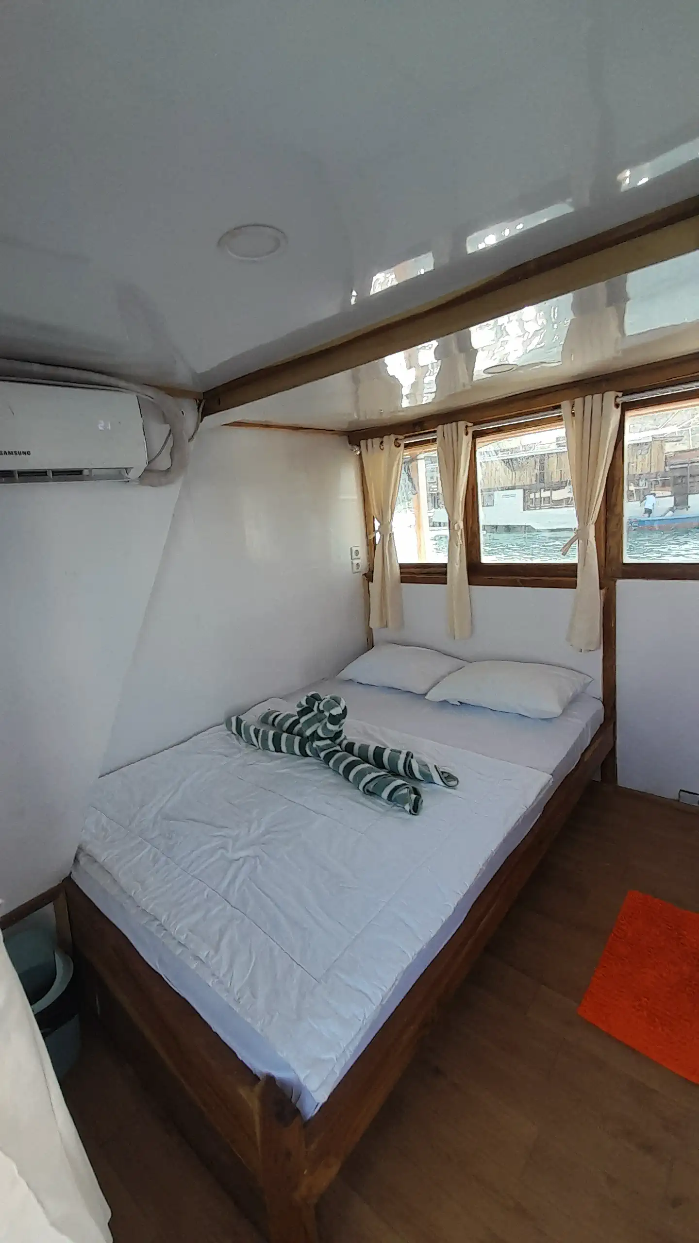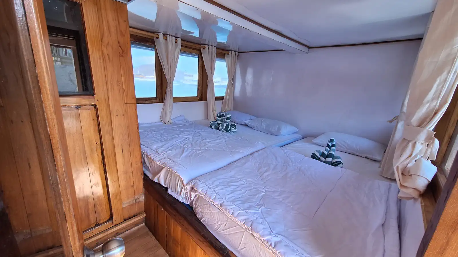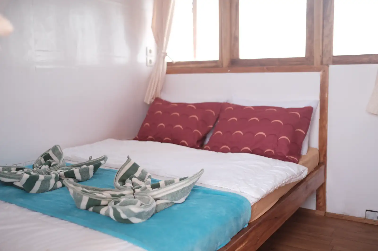 The Double Cabin is designed for comfort and simplicity, featuring a private balcony with sea views, a double bed, and an ensuite bathroom with shower and toilet. With air conditioning, fresh towels, and practical amenities like electric plugs and bed covers, it’s a cozy option for couples or friends who want a private space to relax after exploring Komodo National Park.