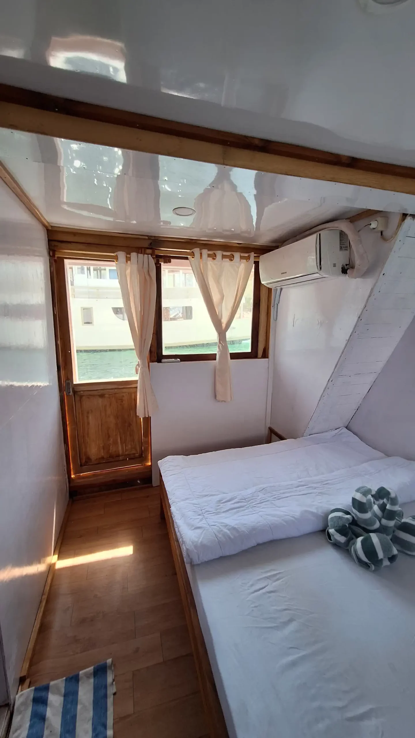 The Triple Cabin is a practical choice for small groups or families, offering one double bed and one single bed in a shared space. With an ensuite bathroom, air conditioning, fresh towels, and handy amenities like electric plugs and bed covers, it provides a simple and comfortable base for exploring Komodo National Park together.