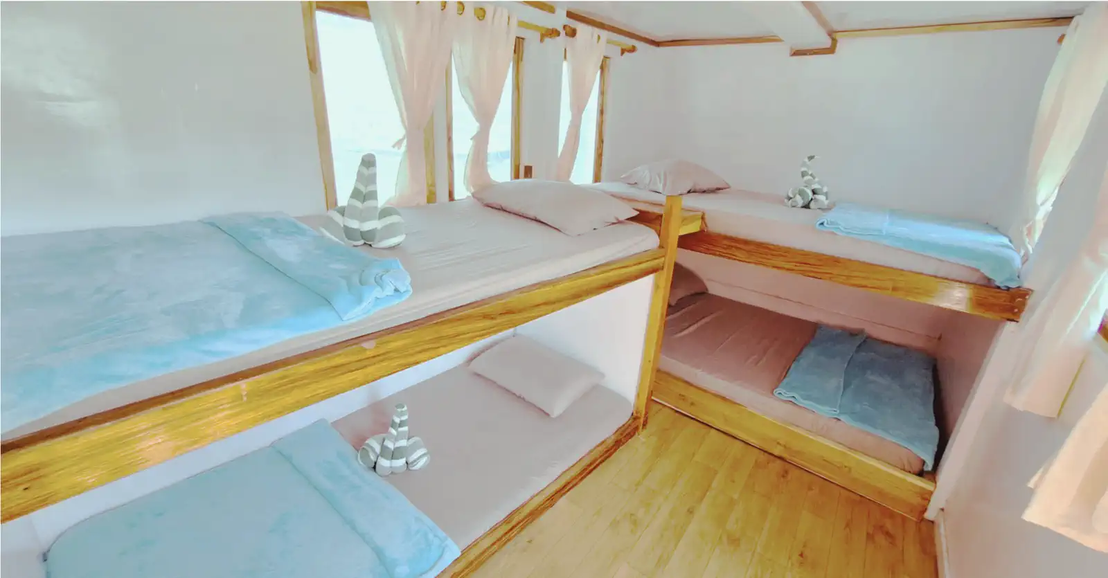 The Sharing Cabin is ideal for groups of friends or budget travelers who don’t mind a social setup. With two single bunks and two double bunks, it can accommodate up to five people in one room. An ensuite bathroom and air conditioning add comfort, while the shared layout makes it the most affordable way to join an Asterix liveaboard adventure in Komodo National Park.